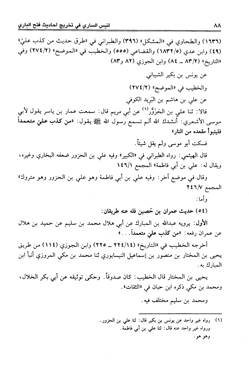 قالا: ثنا علي بن الحَزَوَّر (¬1) عن أبي مريم قال: سمعت عمار بن ياسر يقول لأبي موسى الأشعري: أنشدك الله ألم تسمع رسول الله -صلى الله عليه وسلم- يقول: "من كذب عليّ متعمداً فليتبوأ مقعده من النار"