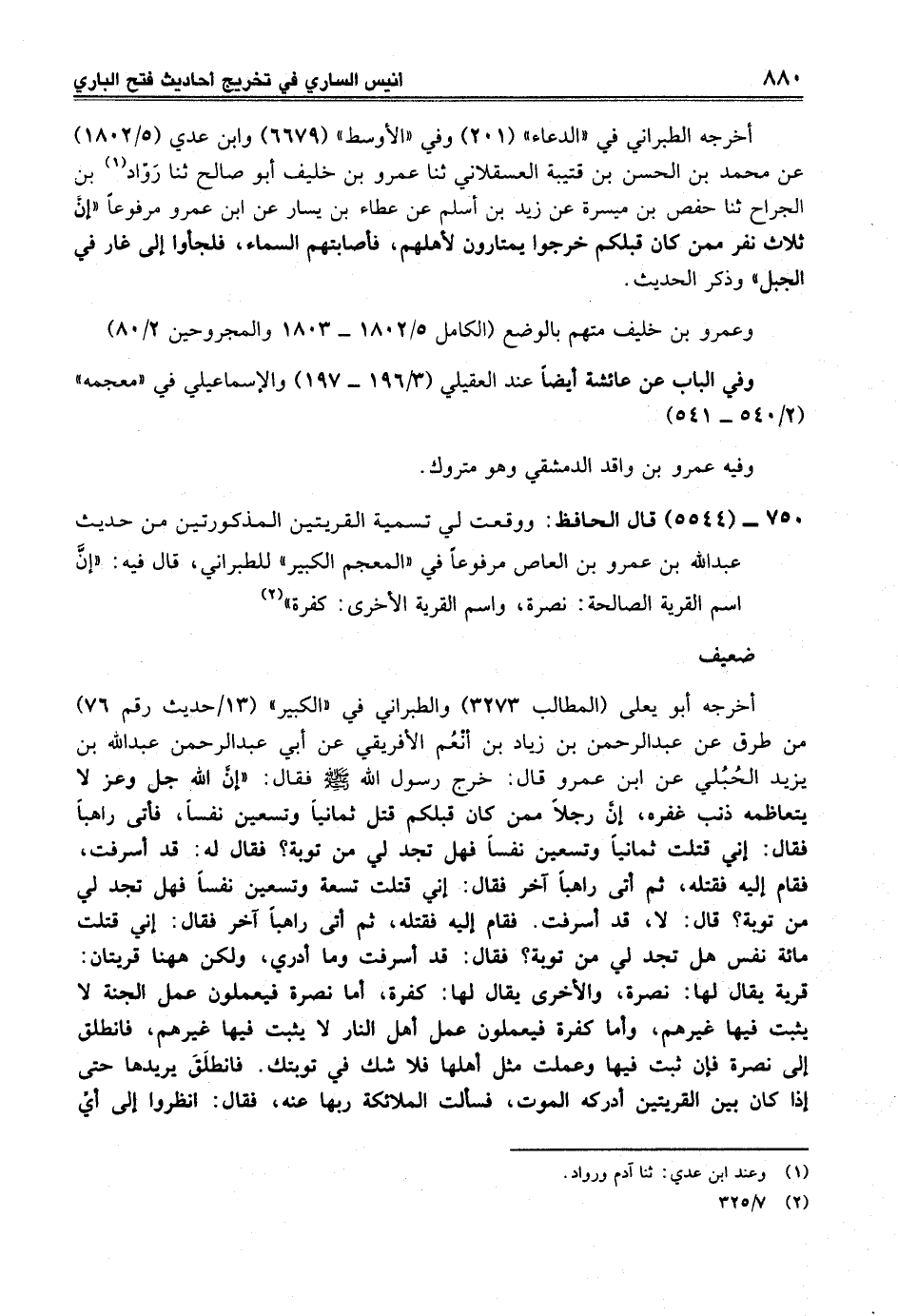 750 - (5544) قال الحافظ: ووقعت لي تسمية القريتين المذكورتين من حديث عبد الله بن عمرو بن العاص مرفوعاً في "المعجم الكبير" للطبراني، قال فيه: "إنَّ اسم القرية الصالحة: نصرة، واسم القرية الأخرى: كفرة" (¬2)