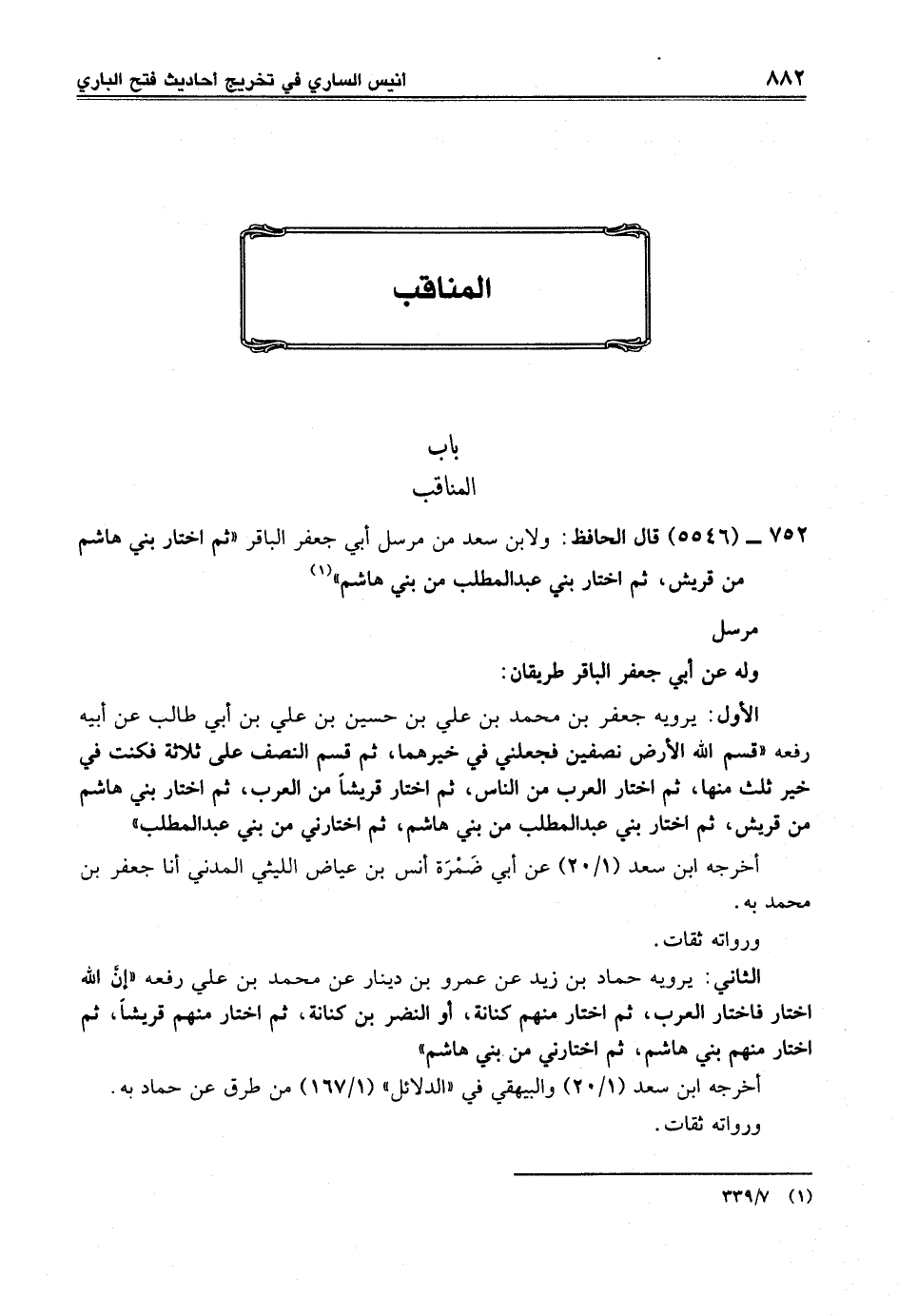 752 - (5546) قال الحافظ: ولابن سعد من مرسل أبي جعفر الباقر "ثم اختار بني هاشم من قريش، ثم اختار بني عبد المطلب من بني هاشم" (¬1)