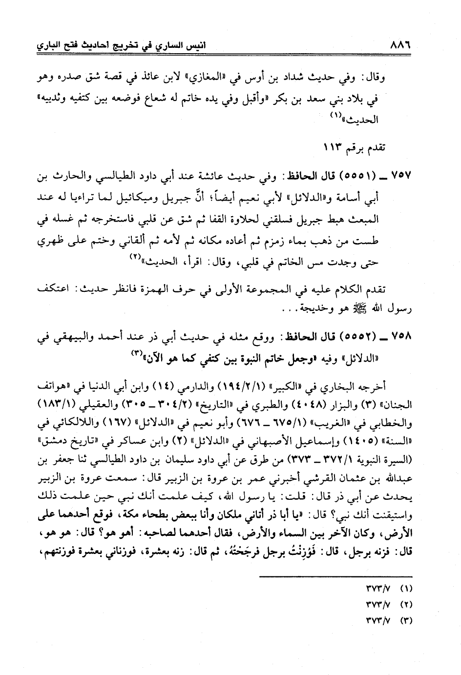 758 - (5552) قال الحافظ: ووقع مثله في حديث أبي ذر عند أحمد والبيهقي في "الدلائل" وفيه "وجعل خاتم النبوة ببن كتفي كما هو الآن" (¬3)