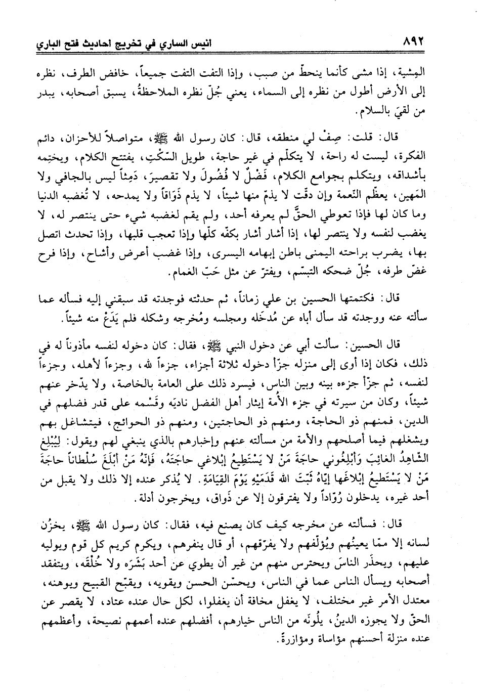 قال: فسألته عن مخرجه كيف كان يصنع فيه، فقال: كان رسول الله -صلى الله عليه وسلم-، يخزُن لسانه إلا ممّا يعينُهم ويُؤلّفهم ولا يفرقهم، أو قال ينفرهم، ويكرمِ كريم كل قوم ويوليه عليهم، ويحذَر الناسَ ويحترس منهم من غير أن يطوي عن أحد بَشرَه ولا خُلْقَه، ويتفقد أصحابه ويسأل الناس عما في الناس، ويحسّن الحسن ويقويه، ويقبّح القبيح ويوهنه، معتدل الأمر غير مختلف، لا يغفل مخافة أن يغفلوا، لكل حال عنده عتاد، لا يقصر عن الحقّ ولا يجوزه الدينُ، يلُونَه من الناس خيارهم، أفضلهم عنده أعمهم نصيحة، وأعظمهم عنده منزلة أحسنهم مؤاساة ومؤازرة.