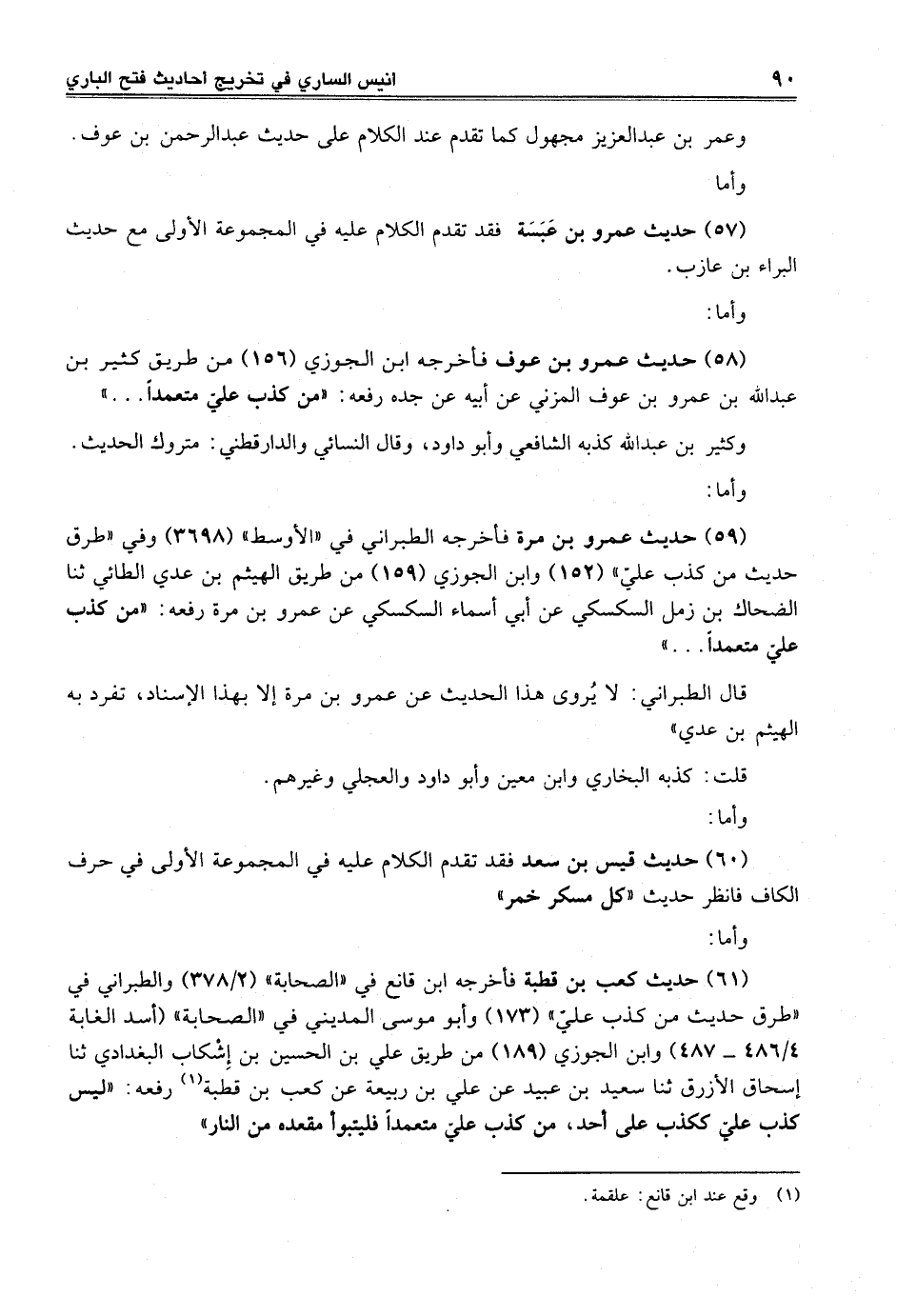 (58) حديث عمرو بن عوف فأخرجه ابن الجوزي (156) من طريق كثير بن عبد الله بن عمرو بن عوف المزني عن أبيه عن جده رفعه: "من كذب عليّ متعمداً ... "