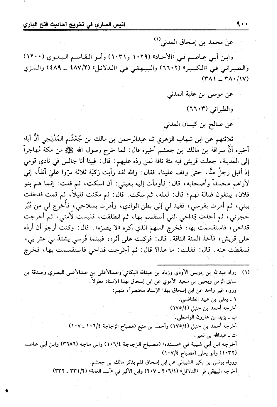 ثلاثتهم عن ابن شهاب الزهري ثنا عبد الرحمن بن مالك بن جُعْشُم المُدْلِجي أنَّ أباه أخبره أنَّ سراقة بن مالك بن جعشم أخبره قال: لما خرج رسول الله -صلى الله عليه وسلم- من مكة مُهاجراً إلى المدينة، جعلت قريش فيه مئة ناقة لمن رده عليهم: قال: فبينا أنا جالس في نادي قومي إذ أقبل رجلٌ منَّا، حتى وقف علينا، فقال: والله لقد رأيت رَكبَة ثلاثة مرّوا عليّ آنفاً، إني لأراهم محمداً وأصحابه، قال: فأومأت إليه بعيني: أن اسكت، ثم قلت: إنما هم بنو فلان، يبتغون ضالة لهم؛ قال: لعله، ثم سكت. قال: ثم مكثت قليلاً، ثم قمت فدخلت بيتي، ثم أمرت بفرسي، فقيد لي إلى بطن الوادي، وأمرت بسلاحي، فأخرج لي من دُبُر حجرتي، ثم أخذت قِداحي التي أستقسم بها، ثم انطلقت، فلبست لَأمتي، ثم أخرجت قداحى، فاستقسمت بها؛ فخرج السهم الذي أكره "لا يضرّه". قال: وكنت أرجو أن أردّه على قريش، فآخذ المئة الناقة. قال: فركبت على أثره، فبينما فَرسي يشتدّ بي عثر بي، فسقطت عنه. قال: فقلت: ما هذا؟ قال: ثم أخرجت قداحي فاستقسمت بها، فخرج