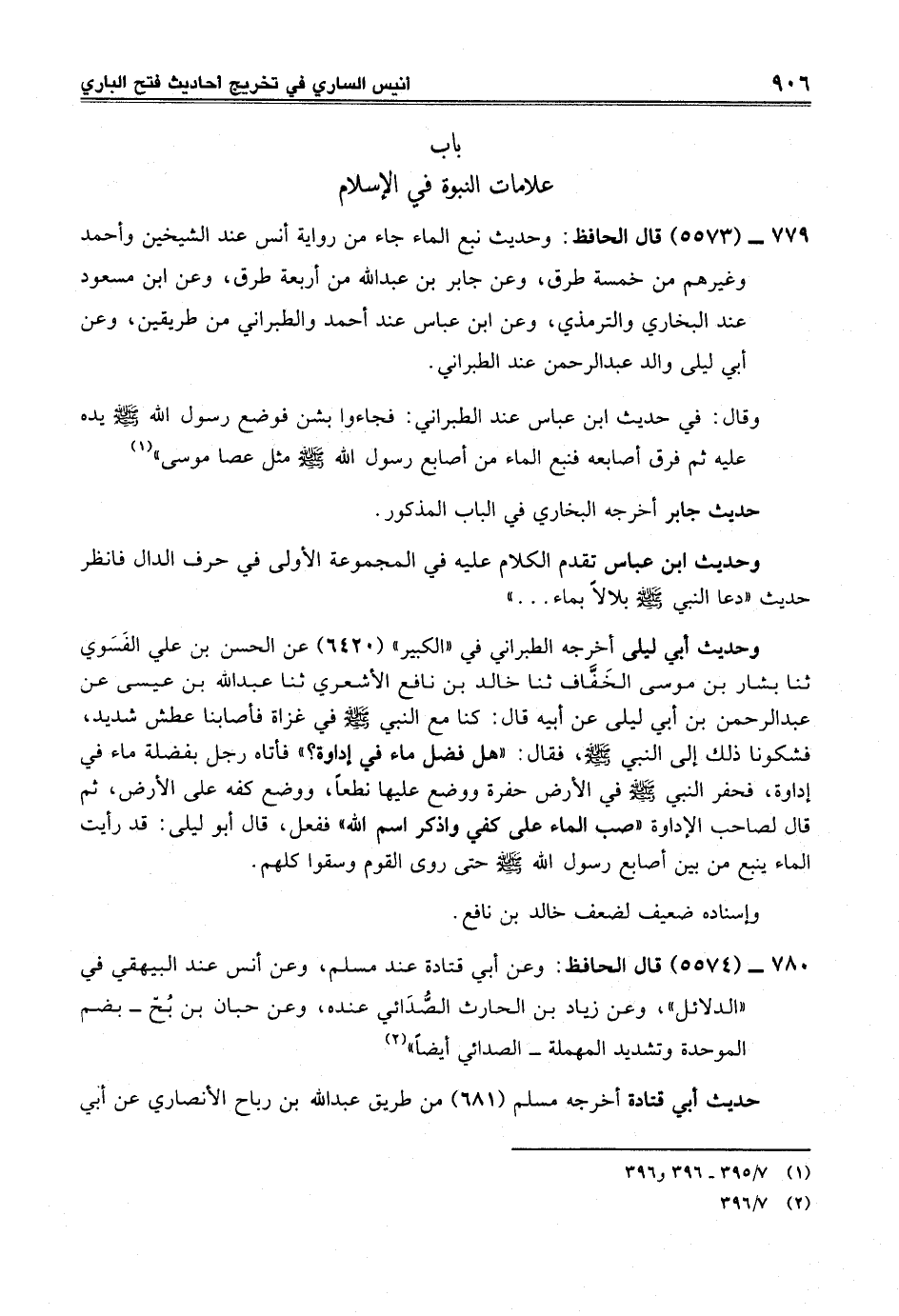 779 - (5573) قال الحافظ: وحديث نبع الماء جاء من رواية أنس عند الشيخين وأحمد وغيرهم من خمسة طرق، وعن جابر بن عبد الله من أربعة طرق، وعن ابن مسعود عند البخاري والترمذي، وعن ابن عباس عند أحمد والطبراني من طريقين، وعن أبي ليلى والد عبد الرحمن عند الطبراني.