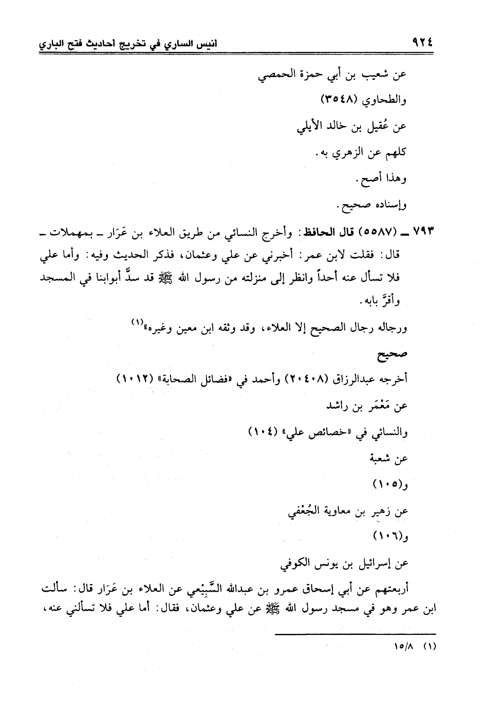 793 - (5587) قال الحافظ: وأخرج النسائي من طريق العلاء بن عَرَار -بمهملات- قال: فقلت لابن عمر: أخبرني عن علي وعثمان، فذكر الحديث وفيه: وأما علي فلا تسأل عنه أحداً وانظر إلى منزلته من رسول الله -صلى الله عليه وسلم- قد سدَّ أبوابنا في المسجد وأقرَّ بابه.