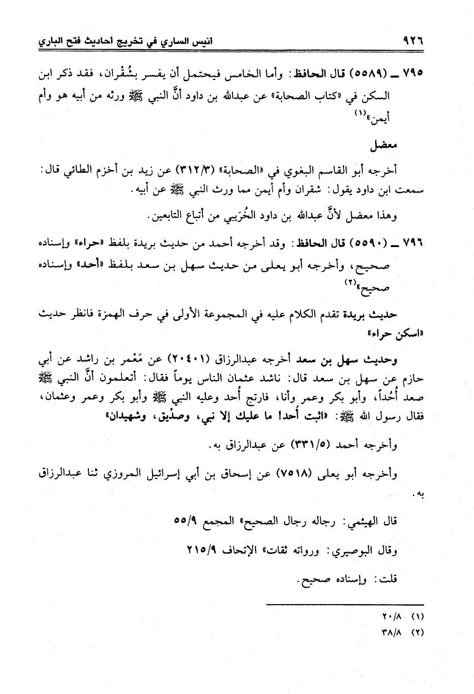 795 - (5589) قال الحافظ: وأما الخامس فيحتمل أن يفسر بشُقْران، فقد ذكر ابن السكن في "كتاب الصحابة" عن عبد الله بن داود أنَّ النبي -صلى الله عليه وسلم- ورثه من أبيه هو وأم أيمن" (¬1)