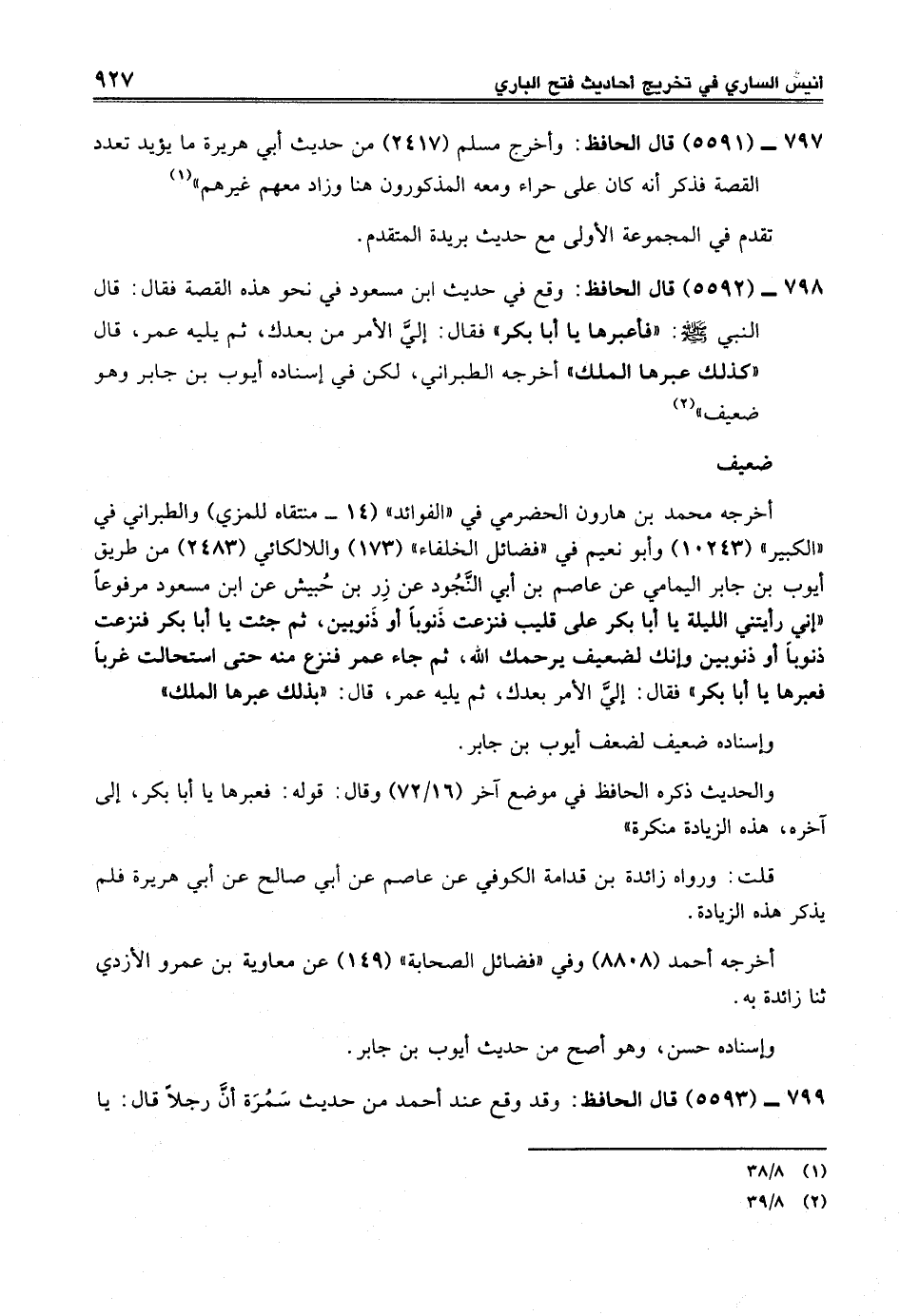 798 - (5592) قال الحافظ: وقع في حديث ابن مسعود في نحو هذه القصة فقال: قال النبي -صلى الله عليه وسلم-: "فأعبرها يا أبا بكر" فقال: إليَّ الأمر من بعدك، ثم يليه عمر، قال "كذلك عبرها الملك" أخرجه الطبراني، لكن في إسناده أيوب بن جابر وهو ضعيف" (¬2)