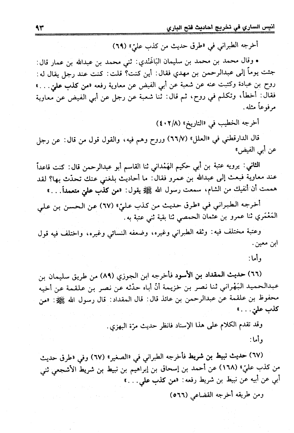 (66) حديث المقداد بن الأسود فأخرجه ابن الجوزي (89) من طريق سليماد بن عبد الحميد البَهْراني ثنا نصر بن خزيمة أنّ أباه حدّثه عن نصر بن علقمة عن أخيه محفوظ بن علقمة عن عبد الرحمن بق عائذ قال: قال المقداد: قال رسول الله -صلى الله عليه وسلم-: "من كذب عليّ ... "
