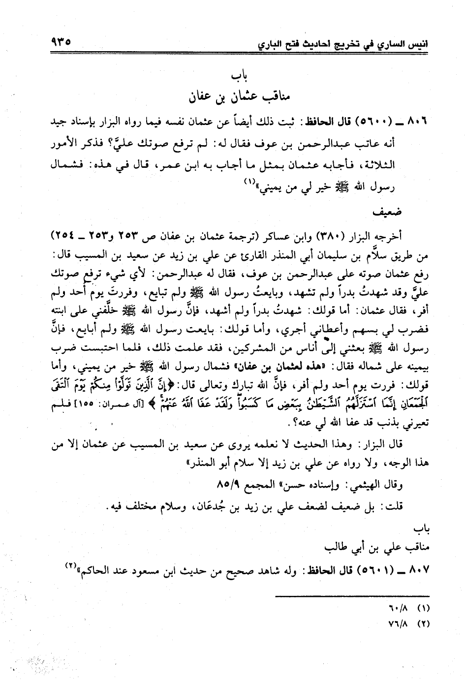 806 - (5600) قال الحافظ: ثبت ذلك أيضاً عن عثمان نفسه فيما رواه البزار بإسناد جيد أنه عاتب عبد الرحمن بن عوف فقال له: لم ترفع صوتك عليَّ؟ فذكر الأمور الثلاثة، فأجابه عثمان بمثل ما أجاب به ابن عمر، قال في هذه: فشمال رسول الله -صلى الله عليه وسلم- خير لي من يميني" (¬1)