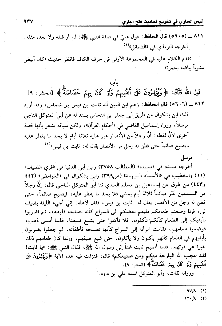 812 - (5606) قال الحافظ: زعم ابن التين أنه ثابت بن قيس بن شماس، وقد أورد ذلك ابن بشكوال من طريق أبي جعفر بن النحاس بسند له عن أبي المتوكل الناجي مرسلاً، ورواه إسماعيل القاضي في "أحكام القرآن"، ولكن سياقه يشعر بأنها قصة أخرى لأنَّ لفظه: أنَّ رجلاً من الأنصار عبر عليه ثلاثة أيام لا يجد ما يفطر عليه ويصبح صائماً حتى فطن له رجل من الأنصار يقال له: ثابت بن قيس" (¬2)