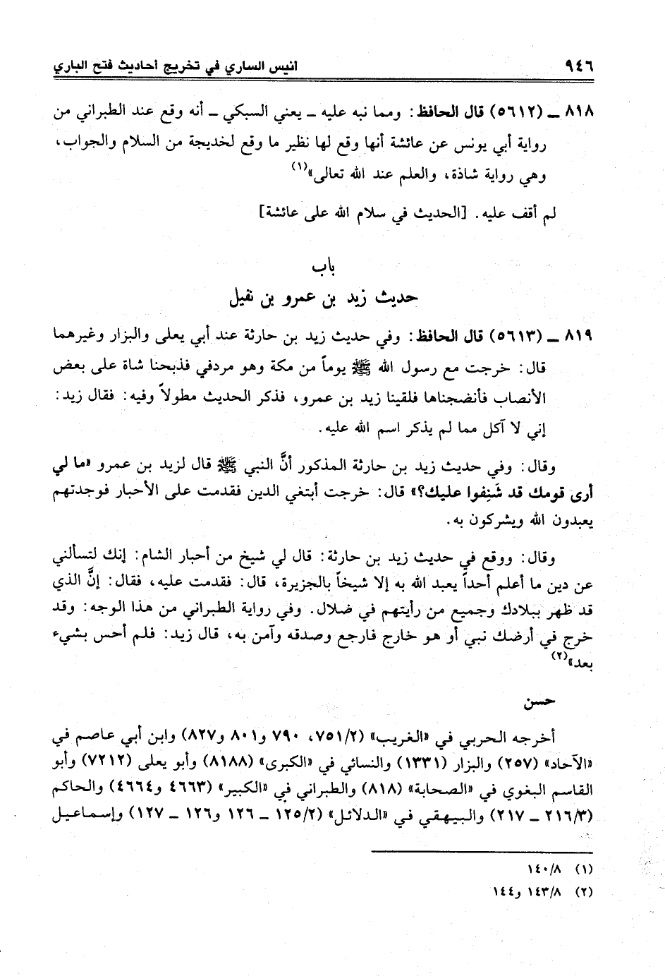 819 - (5613) قال الحافظ: وفي حديث زيد بن حارثة عند أبي يعلى والبزار وغيرهما قال: خرجت مع رسول الله -صلى الله عليه وسلم- يوماً من مكة وهو مردفي فذبحنا شاة على بعض الأنصاب فأنضجناها فلقينا زيد بن عمرو، فذكر الحديث مطولاً وفيه: فقال زيد: إني لا آكل مما لم يذكر اسم الله عليه.
