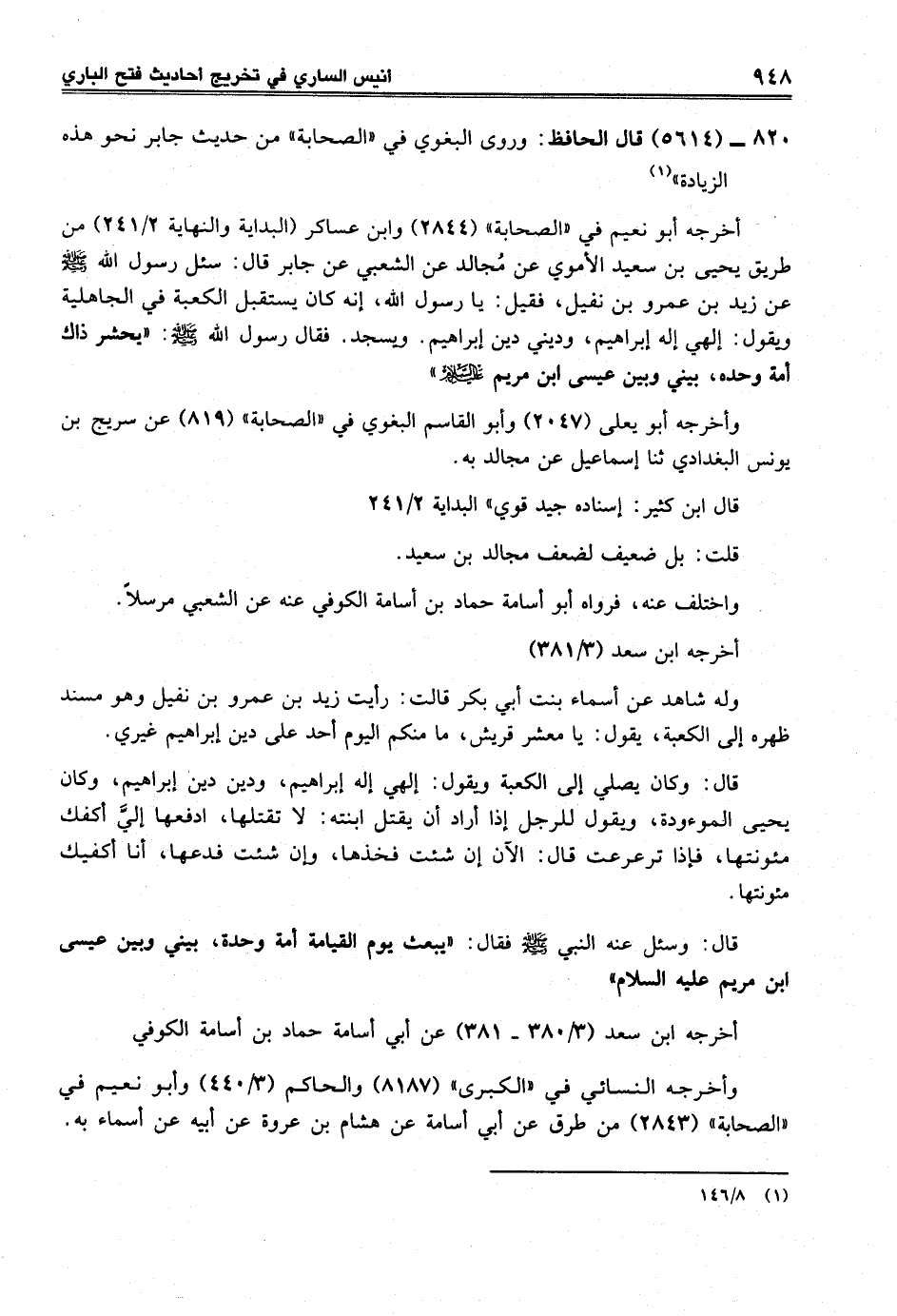 أخرجه أبو نعيم في "الصحابة" (2844) وابن عساكر (البداية والنهاية 2/ 241) من طريق يحيى بن سعيد الأموي عن مُجالد عن الشعبي عن جابر قال: سئل رسول الله -صلى الله عليه وسلم- عن زيد بن عمرو بن نفيل، فقيل: يا رسول الله، إنه كان يستقبل الكعبة في الجاهلية ويقول: إلهي إله إبراهيم، وديني دين إبراهيم. ويسجد. فقال رسول الله -صلى الله عليه وسلم-: "يحشر ذاك أمة وحده، بيني وبين عيسى ابن مريم عليه السلام"