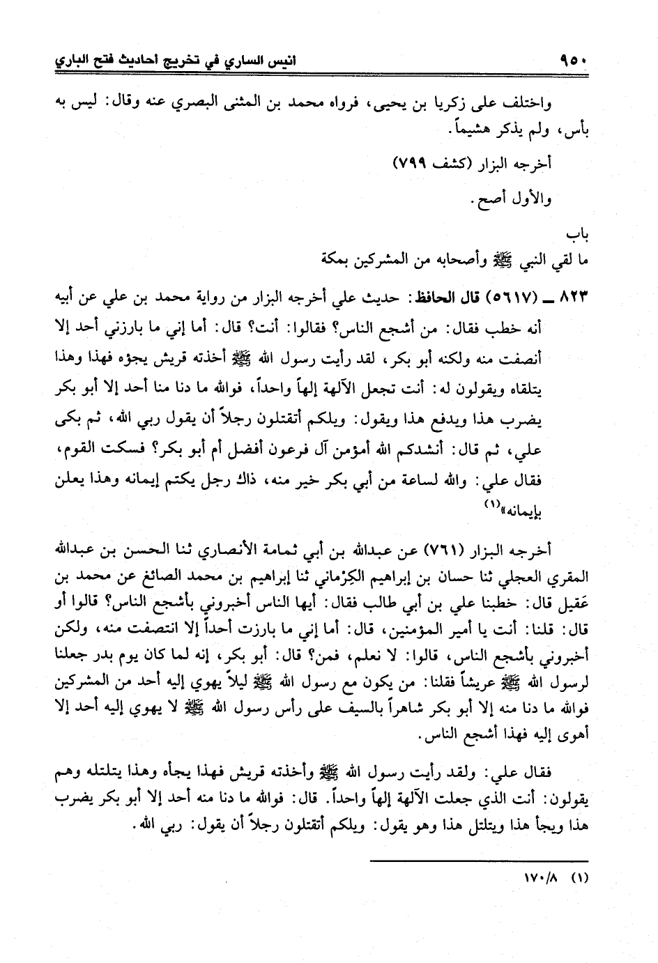 823 - (5617) قال الحافظ: حديث علي أخرجه البزار من رواية محمد بن علي عن أبيه أنه خطب فقال: من أشجع الناس؟ فقالوا: أنت؟ قال: أما إني ما بارزني أحد إلا أنصفت منه ولكنه أبو بكر، لقد رأيت رسول الله -صلى الله عليه وسلم- أخذته قريش يجؤه فهذا وهذا يتلقاه ويقولون له: أنت تجعل الآلهة إلهاً واحداً، فوالله ما دنا منا أحد إلا أبو بكر يضرب هذا ويدفع هذا ويقول: ويلكم أتقتلون رجلاً أن يقول ربي الله، ثم بكى علي، ثم قال: أنشدكم الله أمؤمن آل فرعون أفضل أم أبو بكر؟ فسكت القوم، فقال علي: والله لساعة من أبي بكر خير منه، ذاك رجل يكتم إيمانه وهذا يعلن بإيمانه" (¬1)