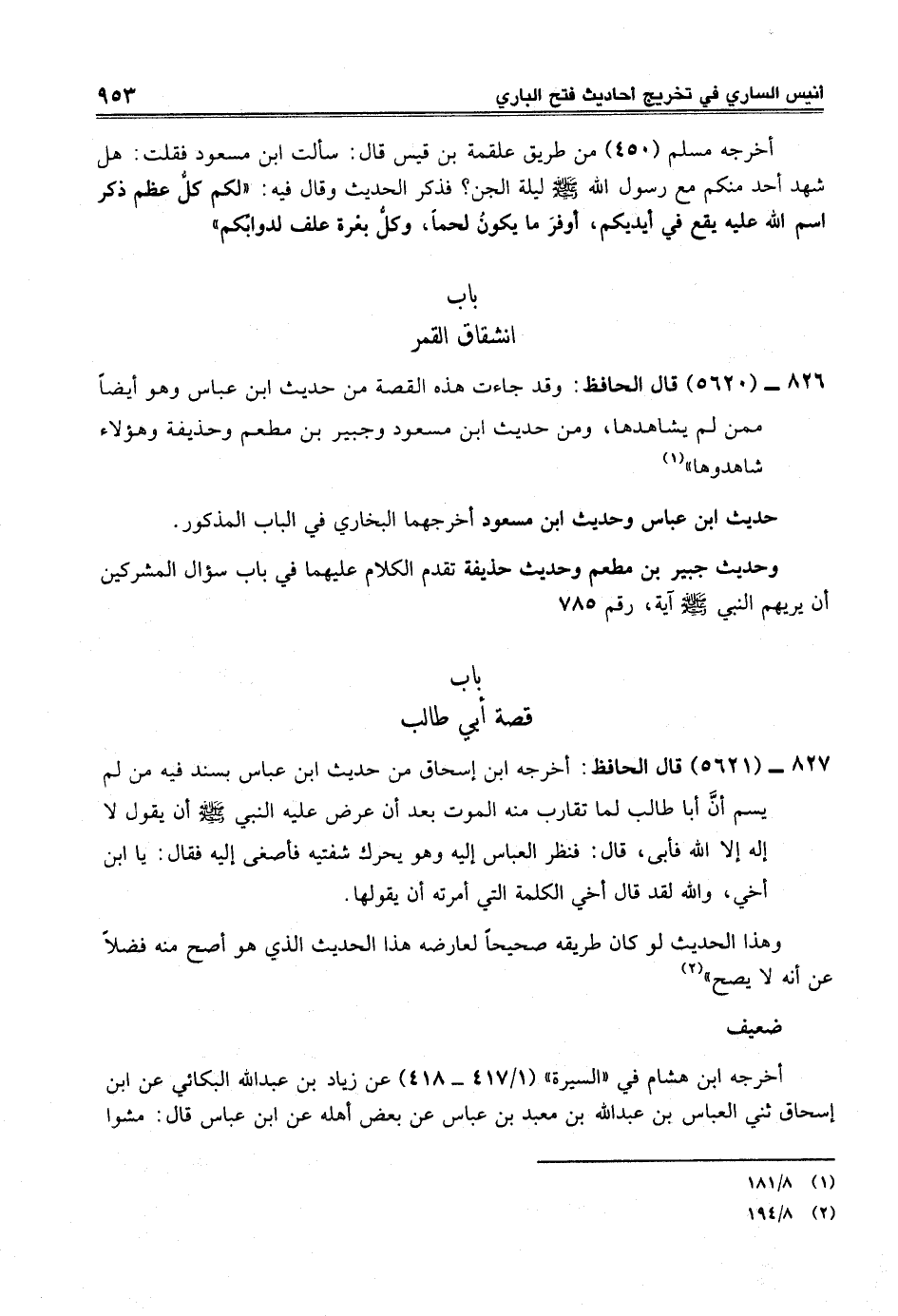 826 - (5620) قال الحافظ: وقد جاءت هذه القصة من حديث ابن عباس وهو أيضاً ممن لم يشاهدها، ومن حديث ابن مسعود وجبير بن مطعم وحذيفة وهؤلاء شاهدوها" (¬1)