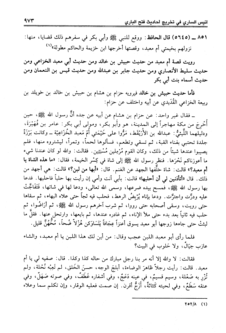 851 - (5645) قال الحافظ: ووقع للنبي -صلى الله عليه وسلم- وأبي بكر في سفرهم ذلك قضايا، منها: نزولهم بخيمتي أم معبد، وقصتها أخرجها ابن خزيمة والحاكم مطولة" (¬1)