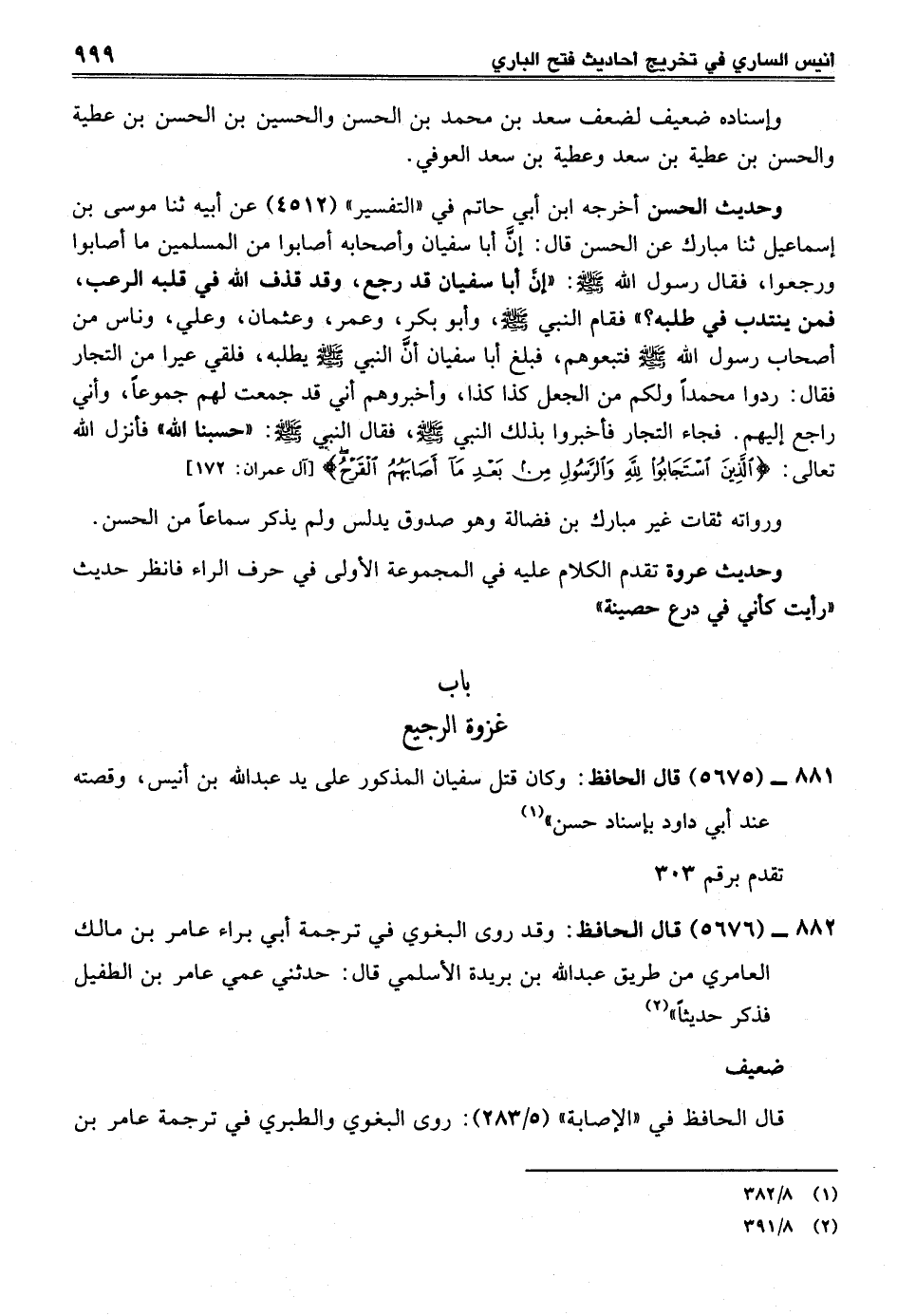 881 - (5675) قال الحافظ: وكان قتل سفيان المذكور على يد عبد الله بن أنيس، وقصته عند أبي داود بإسناد حسن" (¬1)