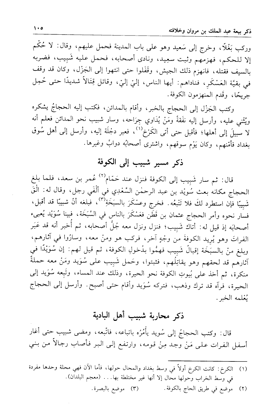 قال : وكتب الحجاج إلى سويد يأثره باتباعه ، فاتبعه ، ومضى شبيب حتى أغار أسفل الفرات على من وجد من قومه ، وارتفع إلى البر فأصاب رجالاً من بني