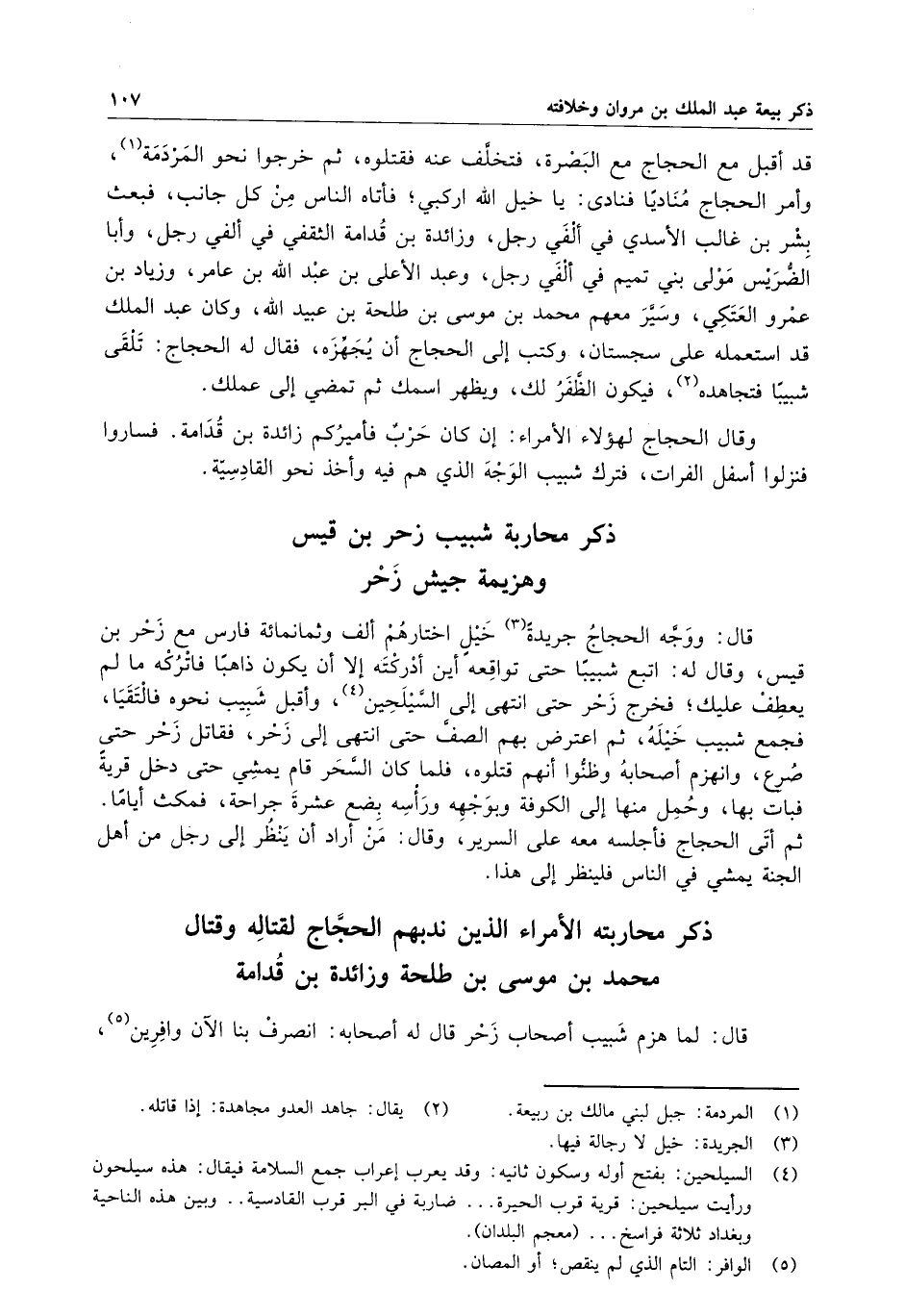 قد أقبل مع الحجاج من البصرة ، فتخلف عنه فقتلوه ، ثم خرجوا نحو المردمة ، وأمر الحجاج منادياً فنادى : يا خيل الله اركبي ؛ فأتاه الناس من كل جانب ، فبعث بشر بن غالب الأسدي في ألفي رجل ، وزائدة بن قدامة الثقفي في ألفي رجل ، وأبا الضريس مولى بني تميم في ألفي رجل ، وعبد الأعلى بن عبد الله بن عامر ، وزياد ابن عمرو العتكي ، وسير معهم محمد بن موسى بن طلحة بن عبيد الله ، وكان عبد الملك قد استعمله على سجستان ، وكتب إلى الحجاج أن يجهزه ، فقال له الحجاج : تلقى شبيباً فتجاهده ، فيكون الظفر لك ، ويظهر اسمك ثم تمضى إلى عملك .