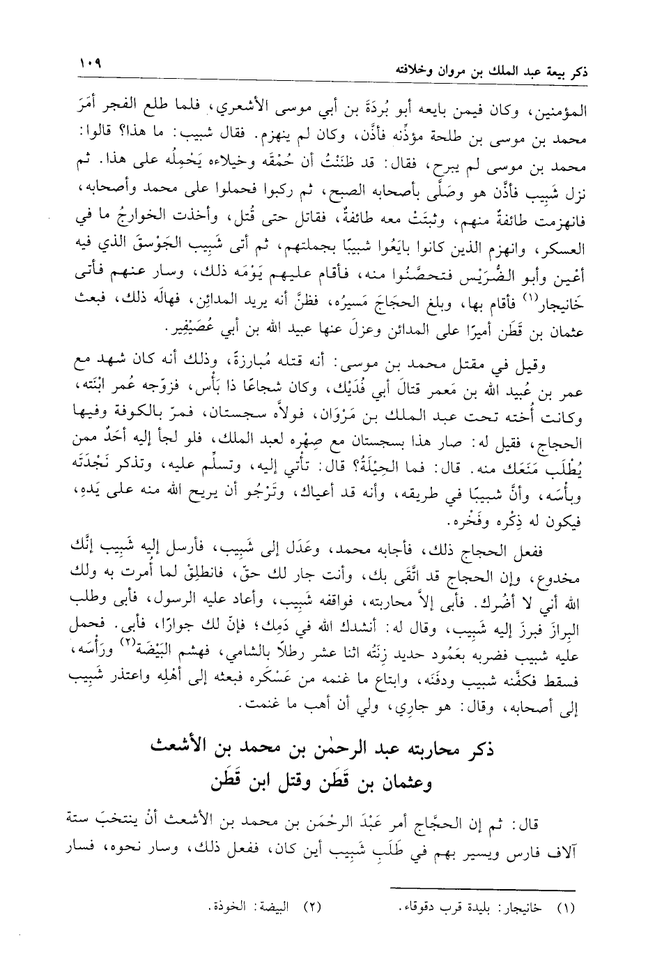المؤمنين ، وكان فيمن بايعه أبو بردة بن أبي موسى الأشعري ، فلما طلع الفجر أمر محمد بن موسى بن طلحة مؤذنه فأذن ، وكان لم ينهزم . فقال شبيب : ما هذا ؟ قالوا : محمد بن موسى لم يبرح ، فقال : قد ظننت أن حمقه وخيلاءه يحمله على هذا . ثم نزل شبيب فأذن هو وصلى بأصحابه الصبح ، ثم ركبوا فحملوا على محمد وأصحابه ، فانهزمت طائفةٌ منهم ، وثبتت معه طائفةٌ ، فقاتل حتى قتل ، وأخذت الخوارج ما في العسكر ، وانهزم الذين كانوا بايعوا شبيباً بجملتهم ، ثم أتى شبيب الجوسق الذي فيه أعين وأبو الضريس فتحصنوا منه ، فأقام عليهم يومه ذلك ، وسار عنهم فأتى خانيجار فأقام بها ، وبلغ الحجاج مسيره ، فظن أنه يريد المدائن ، فهاله ذلك ، فبعث عثمان بن قطن أميراً على المدائن وعزل عنها عبيد الله بن أبي عصيفير .