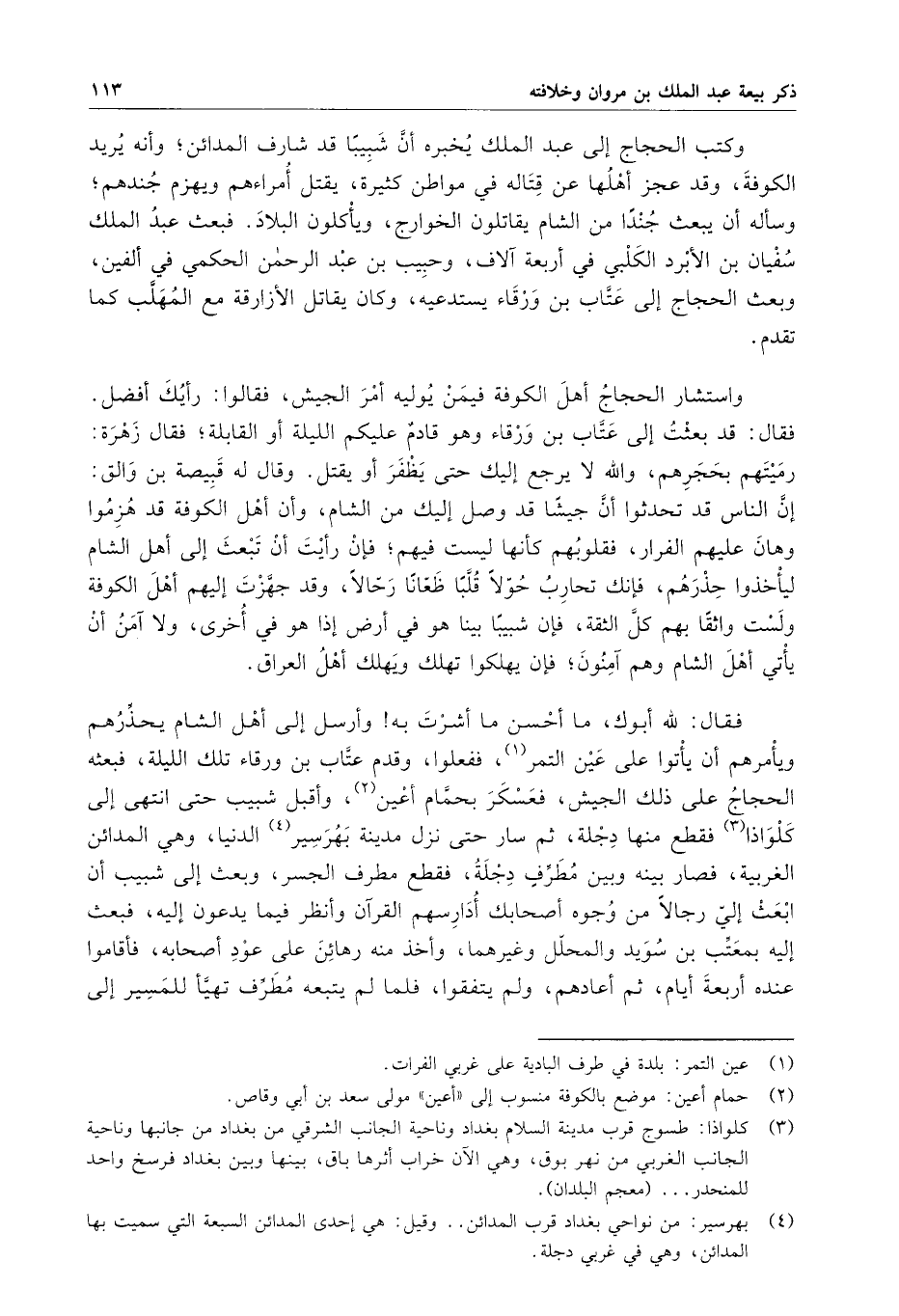 فقال : لله أبوك ، ما أحسن ما أشرت به وأرسل إلى أهل الشام يحذرهم ويأمرهم أن يأتوا على عين التمر ، ففعلوا ، وقدم عتاب بن ورقاء تلك الليلة ، فبعثه الحجاج على ذلك الجيش ، فعسكر بحمام أعين ، وأقبل شبيب حتى انتهى إلى كلواذا فقطع منها دجلة ، ثم سار حتى نزل مدينة بهرسير الدنيا ، وهي المدائن الغربية ، فصار بينه وبين مطرفٍ دجلة ، فقطع مطرف الجسر ، وبعث إلى شبيب أن ابعث إلي رجالا من وجوه أصحابك أدارسهم القرآن وأنظر فيما يدعون إليه ، فبعث إليه بمعتب بن سويد والمحلل وغيرهما ، وأخذ منه رهائن على عود أصحابه ، فأقاموا عنده أربعة أيام ، ثم أعادهم ، ولم يتفقوا ، فلما لم يتبعه مطرف تهيأ للمسير إلى