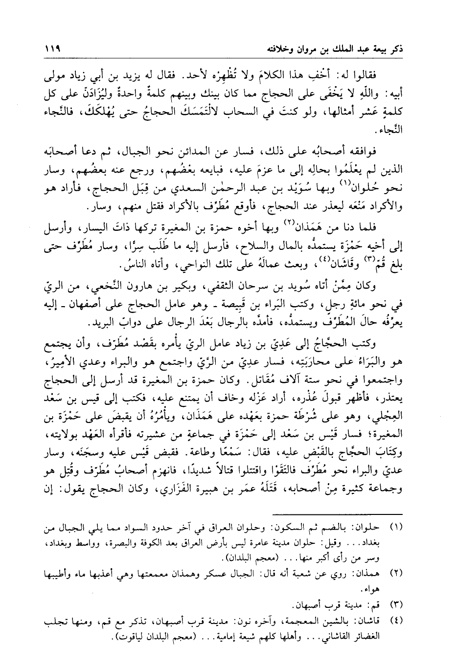 فوافقه أصحابه على ذلك ، فسار عن المدائن نحو الجبال ، ثم دعا أصحابه الذين لم يعلموا بحاله إلى ما عزم عليه ، فبايعه بعضهم ، ورجع عنه بعضهم ، وسار نحو حلوان وبها سويد بن عبد الرحمن السعدي من قبل الحجاج ، فأراد هو والأكراد منعه ليعذر عند الحجاج ، فأوقع مطرف بالأكراد فقتل منهم ، وسار .