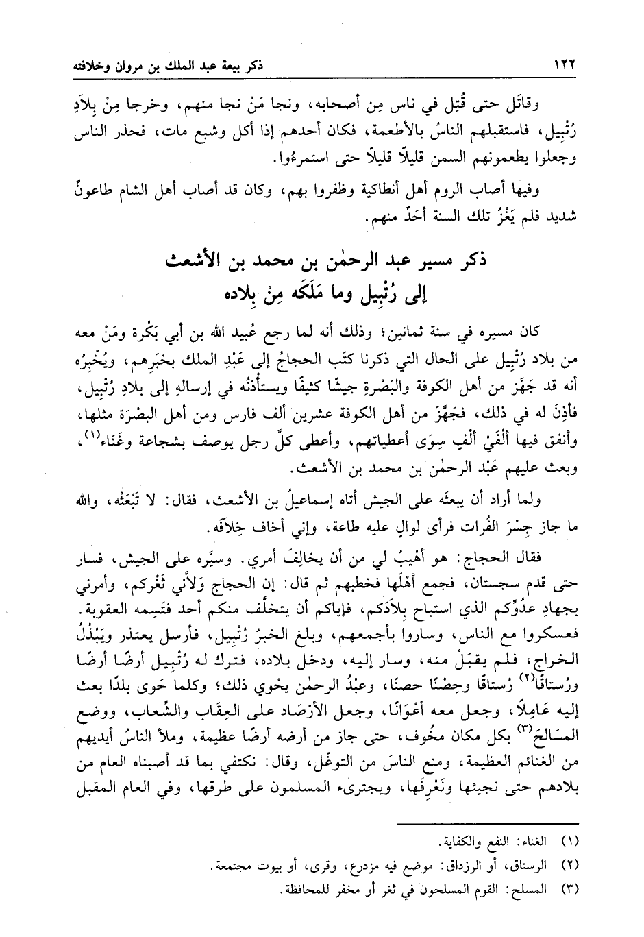 فقال الحجاج : هو أهيب لي من أن يخالف أمري . وسيره على الجيش ، فسار حتى قدم سجستان ، فجمع أهلها فخطبهم ثم قال : إن الحجاج ولاني ثغركم ، وأمرني بجهاد عدوكم الذي استباح بلادكم ، فإياكم أن يتخلف منكم أحد فتسمه العقوبة . فعسكروا مع الناس ، وساروا بأجمعهم ، وبلغ الخبر رتبيل ، فأرسل يعتذر ويبذل الخراج ، فلم يقبل منه ، وسار إليه ، ودخل بلاده ، فترك له رتبيل أرضاً أرضاً ورستاقاً رستاقاً وحصنا حصناً ، وعبد الرحمن يحوي ذلك ؛ وكلما حوى بلداً بعث إليه عاملاً ، وجعل معه أعواناً ، وجعل الأرصاد على العقاب والشعاب ، ووضع المسالح بكل مكان مخوف ، حتى حاز من أرضه أرضاً عظيمة ، وملأ الناس أيديهم من الغنائم العظيمة ، ومنع الناس من التوغل ، وقال : نكتفي بما قد أصبناه العام من بلادهم حتى نجيئها ونعرفها ، ويجترئ المسلمون على طرقها ، وفي العام المقبل