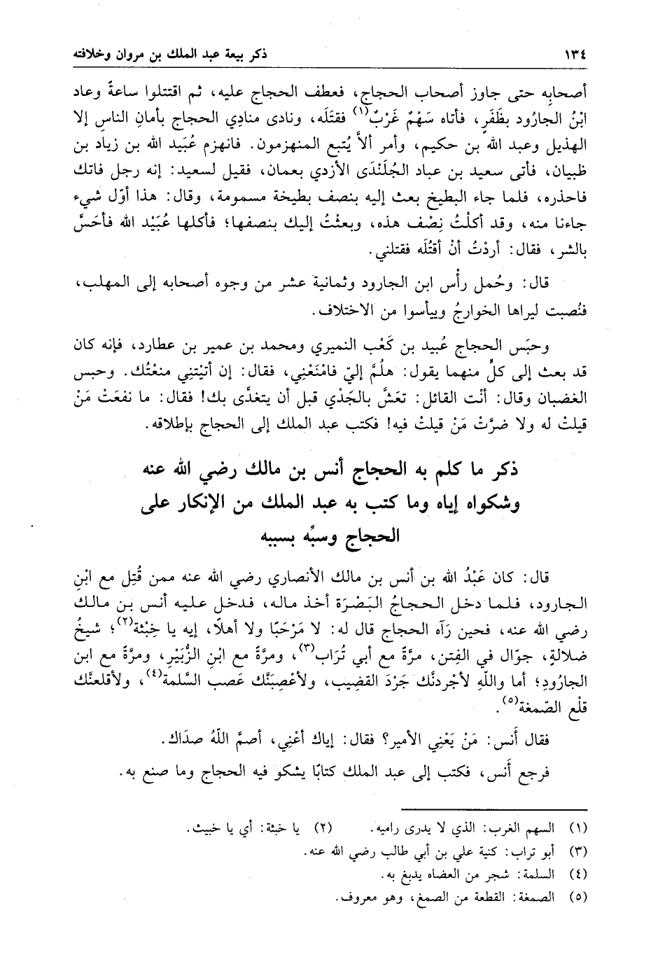 ذكر ما كلم به الحجاج أنس بن مالك رضي الله عنه وشكواه إياه وما كتب به عبد الملك من الإنكار على الحجاج وسبه بسببه