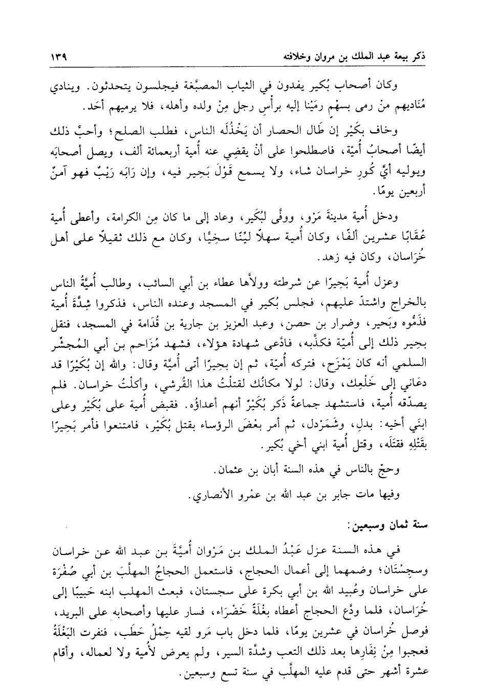 في هذه السنة عزل عبد الملك بن مروان أمية بن عبد الله عن خراسان وسجستان ؛ وضمهما إلى أعمال الحجاج ، فاستعمل الحجاج المهلب بن أبي صفرة على خراسان وعبيد الله بن أبي بكرة على سجستان ، فبعث المهلب ابنه حبيباً إلى خراسان ، فلما ودع الحجاج أعطاه بغلةً خضراء ، فسار عليها وأصحابه على البريد ، فوصل خراسان في عشرين يوما ، فلما دخل باب مرو لقيه حمل حطب ، فنفرت البغلة فعجبوا من نفارها بعد ذلك التعب وشدة السير ، ولم يعرض لأمية ولا لعماله ، وأقام عشرة أشهر حتى قدم عليه المهلب في سنة تسع وسبعين .
