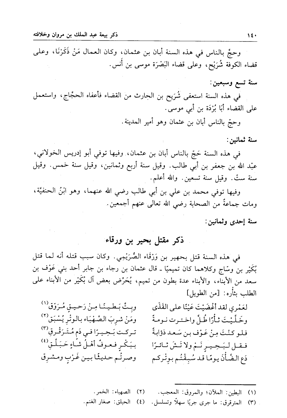 سنة واحد وثمانون بشر القاتل بالقتل لأنه كان سبباً وباعثاً لقتل بكير بن وساج في هذه السنة قتل بحير بن ورقاء الصريمي . وكان سبب قتله أنه لما قتل بكير بن وساج وكلاهما كان تميميا - قال عثمان بن رجاء ابن جابر أحد بني عوف بن سعد من الأبناء ، والأبناء عدة بطون من تميم ، يحرض بعض آل بكير من الأبناء على الطلب بثأره :