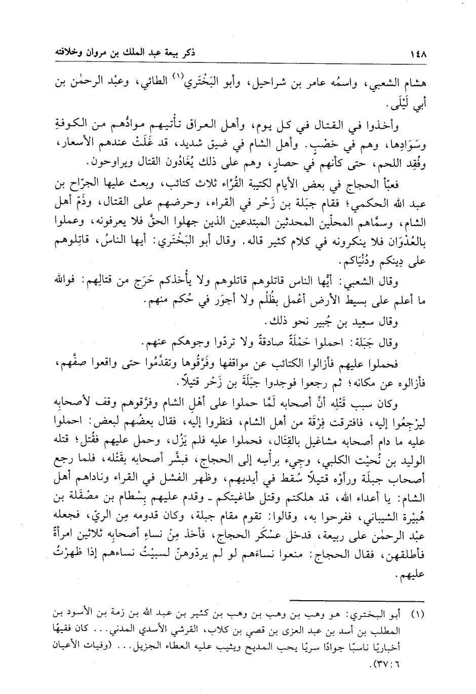 وقال الشعبي : أيها الناس قاتلوهم قاتلوهم ولا يأخذكم حرج سن قتالهم : فوالله ما أعلم على بسيط الأرض أعمل بظلم ولا أجور في حكم منهم .
