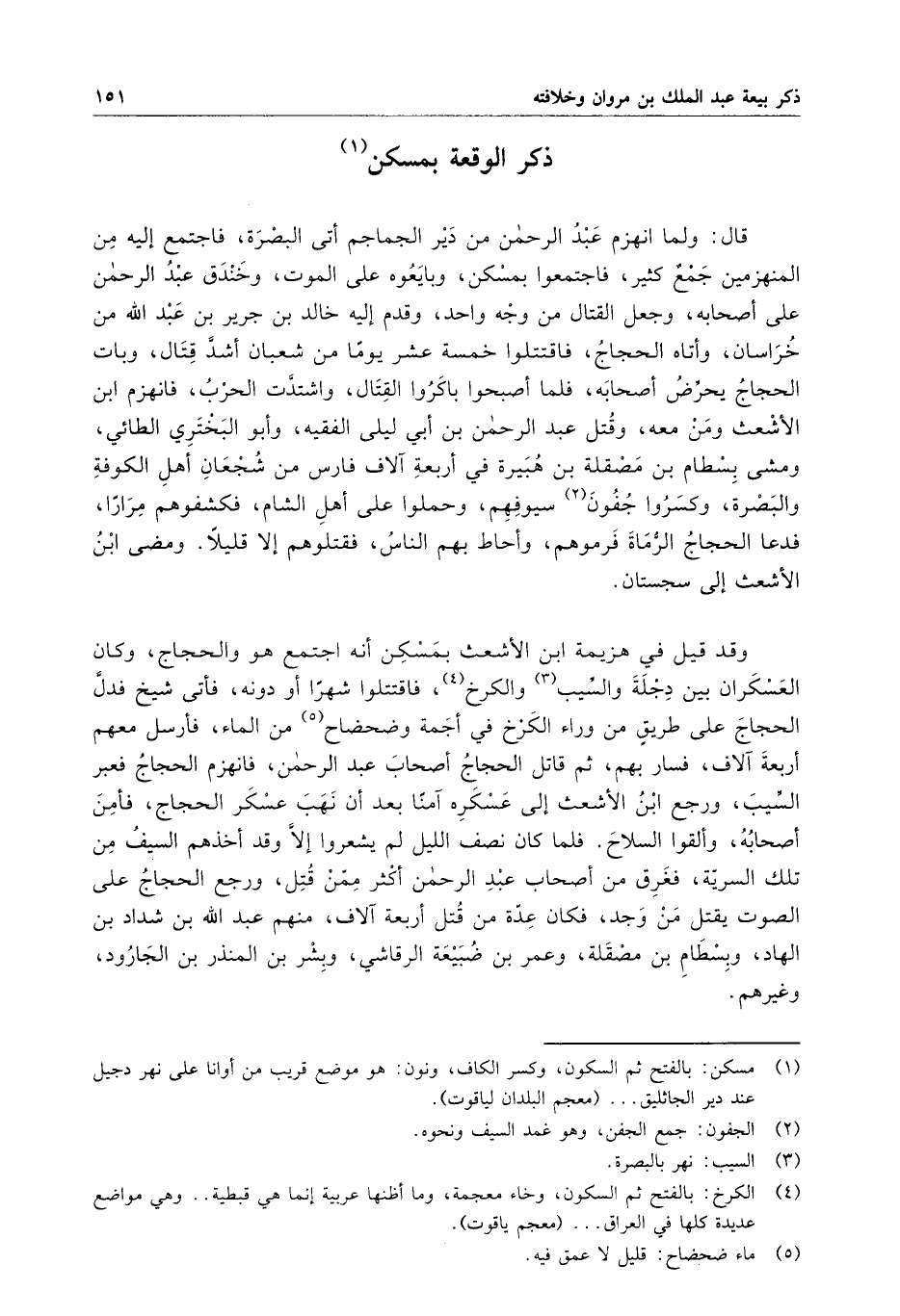 قال : ولما انهزم عبد الرحمن من دير الجماجم أتى البصرة ، فاجتمع إليه من المنهزمين جمعٌ كثير ، فاجتمعوا بمسكن ، وبايعوه على الموت ، وخندق عبد الرحمن على أصحابه ، وجعل القتال من وجه واحد ، وقدم إليه خالد بن جرير بن عبد الله من خراسان ، وأتاه الحجاج ، فاقتتلوا خمسة عشر يوماً من شعبان أشد قتال ، وبات الحجاج يحرض أصحابه ، فلما أصبحوا باكروا القتال ، واشتدت الحرب ، فانهزم ابن الأشعث ومن معه ، وقتل عبد الرحمن بن أبي ليلى الفقيه ، وأبو البختري الطائي ، ومشى بسطام من مصلة بن هبيرة في أربعة آلاف فارس من شجعان أهل الكوفة والبصرة ، وكسروا جفون سيوفهم ، وحملوا على أهل الشام ، فكشفوهم مراراً ، فدعا الحجاج الرماة فرموهم ، وأحاط بهم الناس ، فقتلوهم إلا قليلاً . ومضى ابن الأشعث إلى سجستان . وقد قيل في هزيمة ابن الأشعث بمسكن أنه اجتمع هو والحجاج ، وكان العسكران بين دجلة والسيب والكرخ ، فاقتتلوا شهراً أو دونه ، فأتى شيخ فدل الحجاج على طريقٍ من وراء الكرخ في أجمة وضحضاح من الماء ، فأرسل معهم أربعة آلاف ، فسار بهم ، ثم قاتل الحجاج أصحاب عبد الرحمن ، فانهزم الحجاج فعبر السيب ، ورجع ابن الأشعث إلى عسكره آمناً بعد أن نهب عسكر الحجاج ، فأمن أصحابه ، وألقوا السلاح . فلما كان نصف الليل لم يشعروا إلا وقد أخذهم السيف من تلك السرية ، فغرق من أصحاب عبد الرحمن أكثر ممن قتل ، ورجع الحجاج على الصوت يقتل من وجد ، فكان عدة من قتل أربعة آلاف ، منهم عبد الله بن شداد ابن الهاد ، وبسطام بن مصقلة ، وعمر بن ضبيعة الرقاشي ، وبشر ابن المنذر بن الجارود ، وغيرهم .