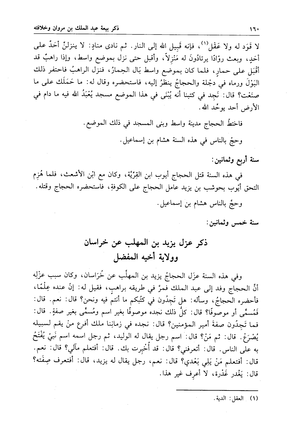وفي هذه السنة عزل الحجاج يزيد بن المهلب عن خراسان ، وكان سبب عزله أن الحجاج وفد إلي عبد الملك فمر في طريقه براهبٍ ، فقيل له : إن عنده علماً ، فأحضره الحجاج ، وسأله : هل تجدون في كتبكم ما أنتم فيه ونحن ؟ قال : نعم . قال : فمسمىً أو موصوفاً ؟ قال : كل ذلك نجده موصوفاً بغير اسم ومسمىً بغير صفةٍ . قال : فما تجدون صفة أمير المؤمنين ؟ قال : نجده في زماننا ملك أفرع من يقم لسبيله يصرع . قال : ثم من ؟ قال : اسم رجل يقال له الوليد ، ثم رجل اسمه اسم نبي يفتح به على الناس . قال : أتعرفني ؟ قال : قد أخبرت بك . قال : أفتعلم ما ألي ؟ قال : نعم . قال : أفتعلم من يلي بعدي ؟ قال : نعم ، رجل يقال له يزيد ، قال : أفتعرف صفته ؟ قال : يغدر غدرة ، لا أعرف غير هذا .