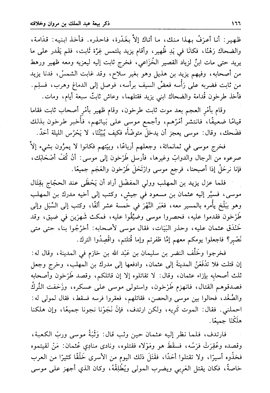 فارتدف ، فلما نظر إليه عثمان حيث وتب قال : وثبة موسى ورب الكعبة ، وقصده وعقرت فرسه ، فسقط هو ومولاه فقتلوه ، ونادى منادي عثمان : من لقيتموه فخذوه أسيراً ، ولا تقتلوا أحداً ، فقتل ذلك اليوم من الأسرى خلقاً كثيراً من العرب خاصةً ، فكان يقتل العربي ويضرب المولى ويطلقه ، وكان الذي أجهز على موسى