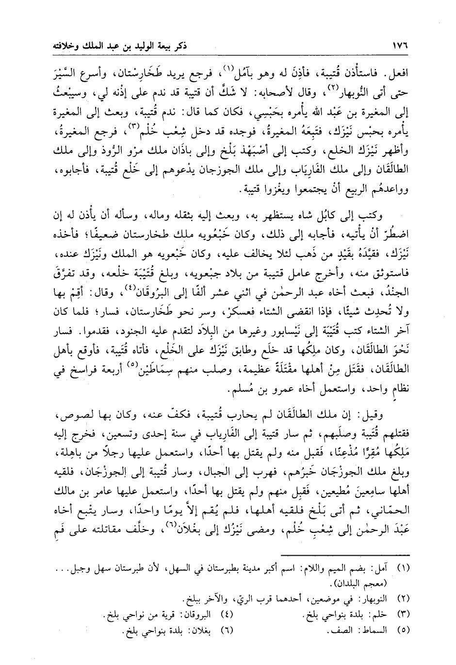 وقيل : إن ملك الطالقان لم يحارب قتيبة ، فكف عنه ، وكان بها لصوص ، فقتلهم قتيبة وصلبهم ، ثم سار قتيبة إلى الفارياب في سنة إحدى وتسعين ، فخرج إليه ملكها مقراً مذعناً ، فقبل منه ولم يقتل بها أحدا ، واستعمل عليها رجلا من باهلة ، وبلغ ملك الجوزجان خبرهم ، فهرب إلى الجبال ، وسار قتيبة إلى الجوزجان ، فلقيه أهلها سامعين مطيعين ، فقبل منهم ولم يقتل بها أحداً ، وساتعمل عليها عامر بن مالك الحماني ، ثم أتى بلخ فلقيه أهلها ، فلم يقم إلا يوماً واحداً ، وسار يتبع أخاه عبد الرحمن إلى شعب خلم ، ومضى نيزك إلى بغلان ، وخلف مقاتلته على فم