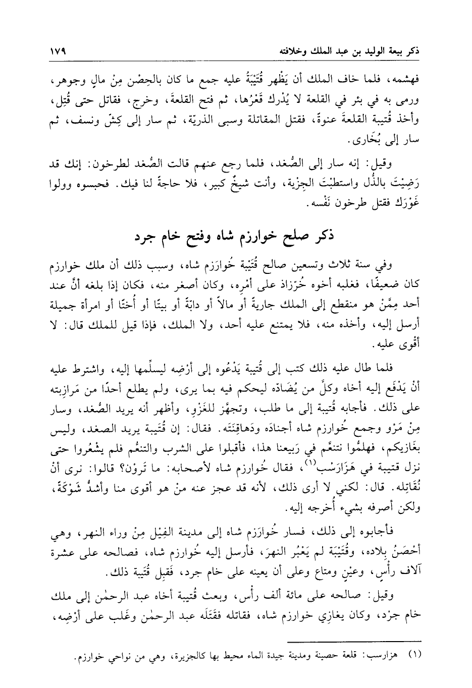 وفي سنة ثلاث وتسعين صالح قتيةب خوارزم شاه ، وسبب ذلك أن ملك خوارزم كان ضعيفاً ، فغلبه أخوه خرزاذ على أمره ، وكان أصغر منه ، فكان إذا بلغه أن عند أحد ممن هو منقطع إلى الملك جاريةً أو مالاً أو دابةً أو بيتاً أو أختاً أو امرأة جميلة أرسل إليه ، وأخذه منه ، فلا يمتنع عليه أحد ، ولا الملك ، فإذا قيل للملك قال : لا أقوى عليه . فلما طال عليه ذلك كتب إلى قتيبة يدعوه إلى أرضه ليسلمها إليه ، واشترط عليه أن يدفع إليه أخاه وكل من يضاده ليحكم فيه بما يرى ، ولم يطلع أحداً من مرازبته على ذلك . فأجابه قتيبة إلى ما طلب ، وتجهز للغزو ، وأظهر أنه يريد الصغد ، وسار من مرو وجمع خوارزم شاه أجناده ودهاقنته . فقال : إن قتيبة يريد الصغد ، وليس بغازيكم ، فهلموا نتنعم في ربيعنا هذا ، فأقبلوا على الشرب والتنعم فلم يشعروا حتى نزل قتيبة في هزارسب ، فقال خوارزم شاه لأصحابه : ما ترون ؟ قالوا : نرى أن نقاتله . قال : لكني لا أرى ذلك ، لأنه قد عجز عنه من هو أقوى منا وأشد شوكةً ، ولكن أصرفه بشيء أخرجه إليه .