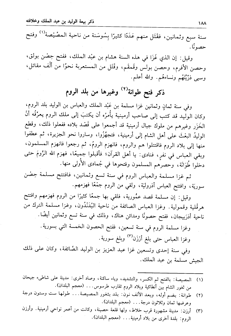 وفي سنة ثمانٍ وثمانين غزا مسلمة بن عبد الملك والعباس ابن الوليد بلد الروم ، وكان الوليد قد كتب إلى صاحب أرمينية يأمره أن يكتب إلى ملك الروم يعرفه أن الخزر وغيرهم من ملوك جبال أرمينية قد أجمعوا على قصد بلاده ففعلوا ذلك ، وقطع الوليد البعث على أهل الشام إلى أرمينية ، فتجهزوا ، وساروا نحو الجزيرة ، ثم عطفوا منها إلى بلاد الروم فاقتتلوا هم والروم ، فانهزم الروم ، ثم رجعوا فانهزم المسلمون ، وبقي العباس في نفرٍ ، فنادى : يأهل القرآن ؛ فأقبلوا جميعاً ، فهزم الله الروم حتى دخلوا طوانة ، وحصرهم المسلمون وفتحوها في جمادى الأولى منها .