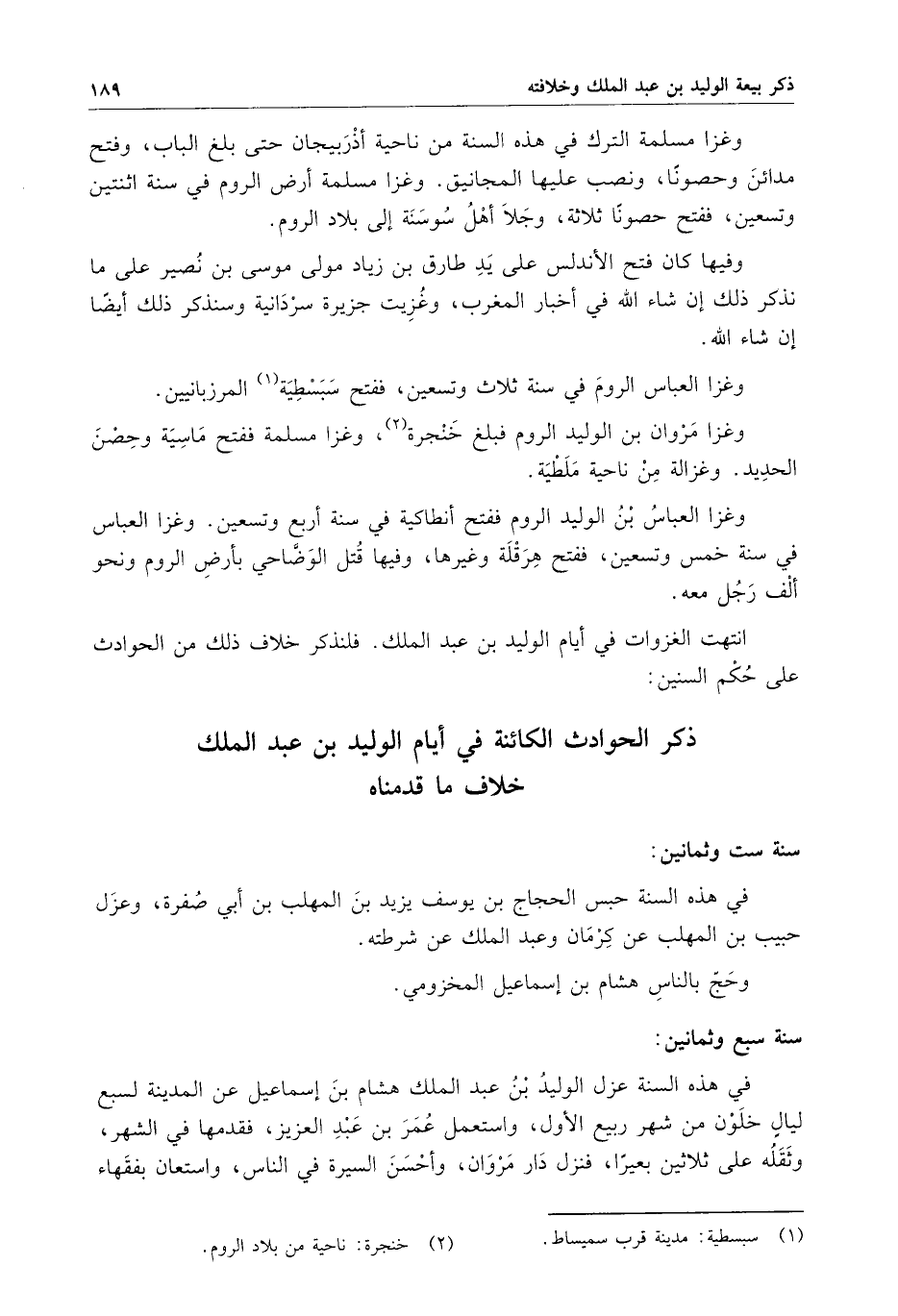 انتهت الغزوات في أيام الوليد بن عبد الملك . فلنذكر خلاف ذلك من الحوادث على حكم السنين :