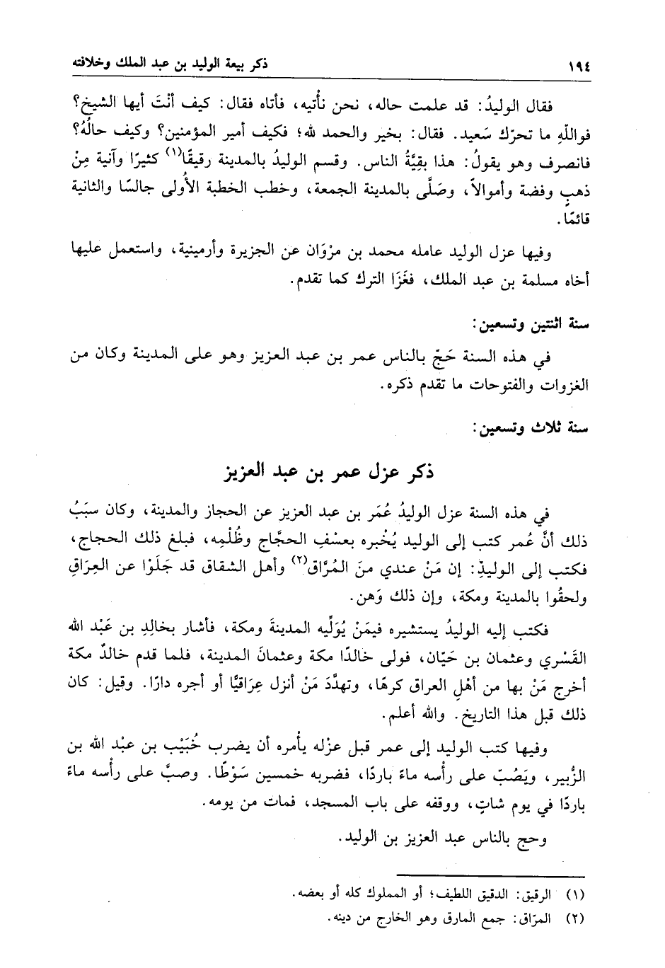 في هذه السنة عزل الوليد عمر بن عبد العزيز عن الحجاز والمدينة ، وكان سبب ذلك أن عمر كتب إلى الوليد يخبره بعسف الحجاج وظلمه ، فبلغ ذلك الحجاج ، فكتب إلى الوليد : إن من عندي من المراق وأهل الشقاق قد جلوا عن العراق ولحقوا بالمدينة ومكة ، وإن ذلك وهن . فكتب إليه الوليد يستشيره فيمن يوليه المدينة ومكة ، فأشار بخالد بن عبد الله القسري وعثمان بن حيان ، فولي خالداً مكة وعثمان المدينة ، فلما قدم خالدٌ مكة أخرج من بها من أهل العراق كرهاً ، وتهدد من أنزل عراقياً أو أجره داراً . وقيل : كان ذلك قبل هذا التاريخ . والله أعلم .