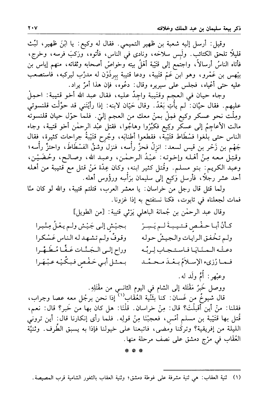 قال شيوخٌ من غسان : كنا بثنية العقاب إذا نحن برجل معه عصا وجراب ، فقلنا : من أين أقبلت ؟ قال : من خراسان . قلنا ؟ هل كان بها من خبر ؟ قال : نعم ، قتل بها قتيبة بن مسلم أمس ، فعجبنا من قوله . فلما رأى إنكارنا قال : أين تروني الليلة من إفريقية ؟ وتركنا ومضى ، فاتبعناه على خيولنا فإذا به يسبق الطرف . وثنية العقاب في مرج دمشق على نصف مرحلة منها .