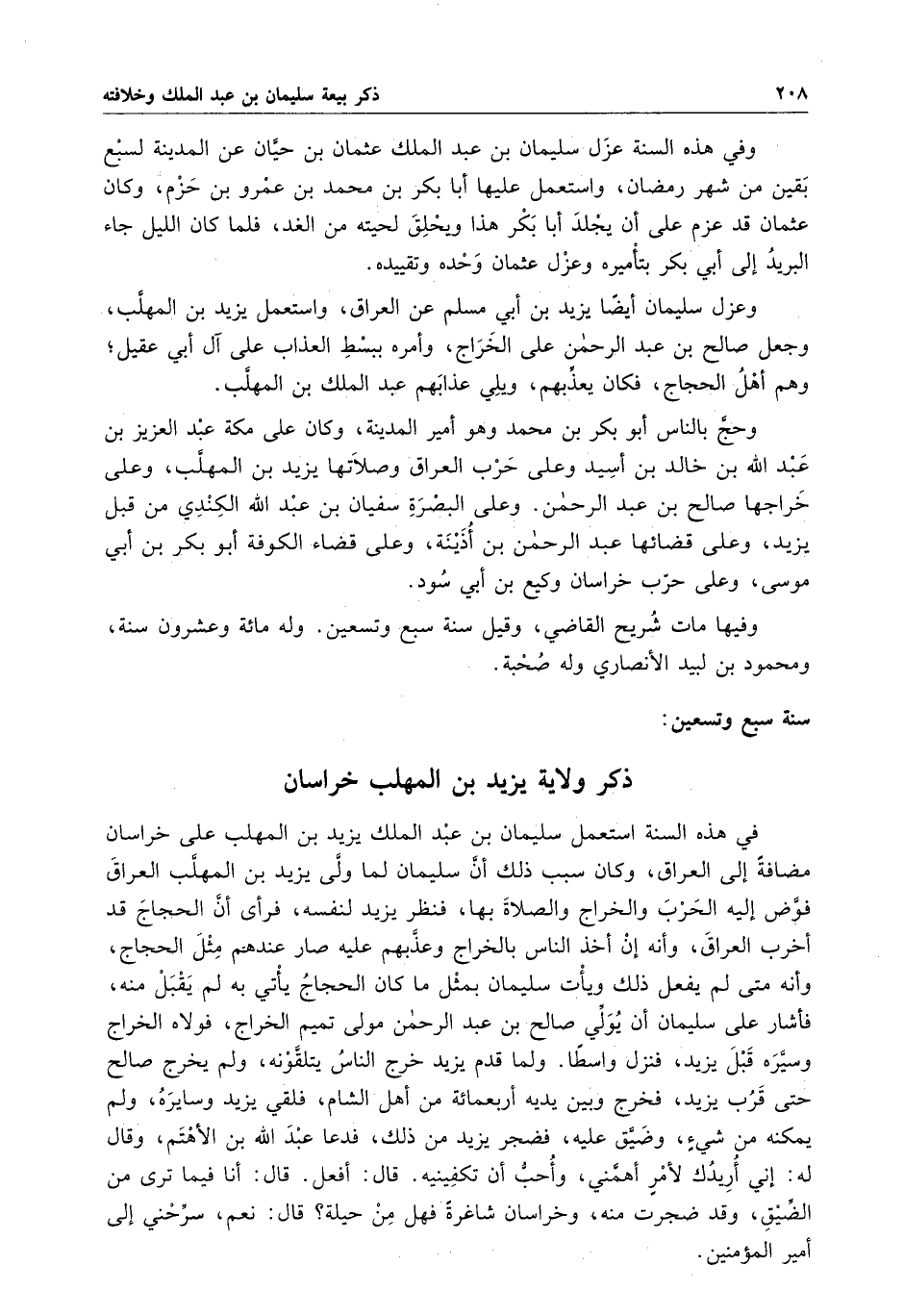 : في هذه السنة استعمل سليمان بن عبد الملك يزيد بن المهلب على خراسان مضافةً إلى العراق ، وكان سبب ذلك أن سليمان لما ولي يزيد بن المهلب العراق فوض إليه الحرب والخراج والصلاة بها ، فنظر يزيد لنفسه ، فرأى أن الحجاج قد أخرب العراق ، وأنه إن أخذ الناس بالخراج وعذبهم عليه صار عندهم مثل الحجاج ، وأنه متى لم يفعل ذلك ويأت سليمان بمثل ما كان الحجاجي أتي به لم يقبل منه ، فأشار على سليمان أن يولي صالح بن عبد الرحمن مولى تميم الخراج ، فولاه الخراج وسيره قبل يزيد ، فنزل واسطا . ولما قدم يزيد خرج الناس يتلقونه ، ولم يخرج صالح حتى قرب يزيد ، فخرج وبين يديه أربعمائة من أهل الشام ، فلقى يزيد وسايره ، ولم يمكنه من شيءٍ ، وضيق عليه ، فضجر يزيد من ذلك ، فدعا عبد الله بن الأهتم ، وقال له : إني أريدك لأمرٍ أهمني ، وأحب أن تكفينيه . قال : أفعل . قال : أنا فيما ترى من الضيق ، وقد ضجرت منه ، وخراسان شاغرةٌ فهل من حيلة ؟ قال : نعم ، سرحني إلى أمير المؤمنين .