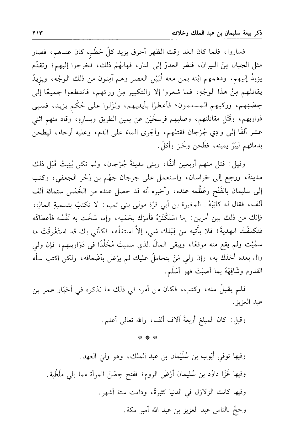 فساروا ، فلما كان الغد وقت الظهر أحرق يزيد كل حطبٍ كان عندهم ، فصار مثل الجبال من النيران ، فنظر العدو إلى النار ، فها لهم ذلك ، فخرجوا إليهم ؛ وتقدم يزيد إليهم ، ودهمهم ابنه بمن معه قبيل العصر وهم آمنون من ذلك الوجه ، ويزيد يقاتلهم من هذا الوجه ، فما شعروا إلا والتكبير من ورائهم ، فانقطعوا جميعا إلى حصنهم ، وركبهم المسلمون ؛ فأعطوا بأيديهم ، ونزلوا على حكم يزيد ، فسبى ذراريهم ، وقتل مقاتلتهم ، وصلبهم فرسخين عن يمين الطريق ويساره ، وقاد منهم اثني عشر ألفا إلى وادي جرجان فقتلهم ، وأجرى الماء على الدم ، وعليه أرحاء ، ليطحن بدمائهم ليبر يمينه ، فطحن وخبز وأكل . وقيل : قتل منهم أربعين ألفاً ، وبنى مدينة جرجان ، ولم تكن بنيت قبل ذلك مدينة ، ورجع إلى خراسان ، واستعمل على جرجان جهم بن زحر الجعفي ، وكتب إلى سليمان بالفتح وعظمه عنده ، وأخبره أنه قد حصل عنده من الخمس ستمائة ألف ألف ، فقال له كاتبه - المغيرة بن أبي قرة مولى بني تميم : لا تكتب بتسمية المال ، فإنك من ذلك بين أمرين : إما استكثره فأمرك بحمله ، وإما سخت به نفسه فأعطاكه فتكلفت الهدية ؛ فلا يأتيه من قبلك شيء إلا استقله ، فكأني بك قد استغرقت ما سميت ولم يقع منه موقعا ، ويبقى المال الذي سميت مخلداً في دواوينهم ، فإن ولي وال بعده أخذك به ، وإن ولي من يتحامل عليك لم يرض بأضعافه ، ولكن اكتب سله القدوم وشافهه بما أصبت فهو أسلم .