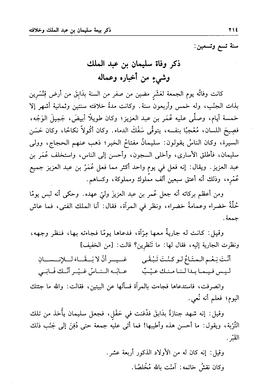 ذكر وفاة سليمان بن عبد الملك وشيءٍ من أخباره وعماله