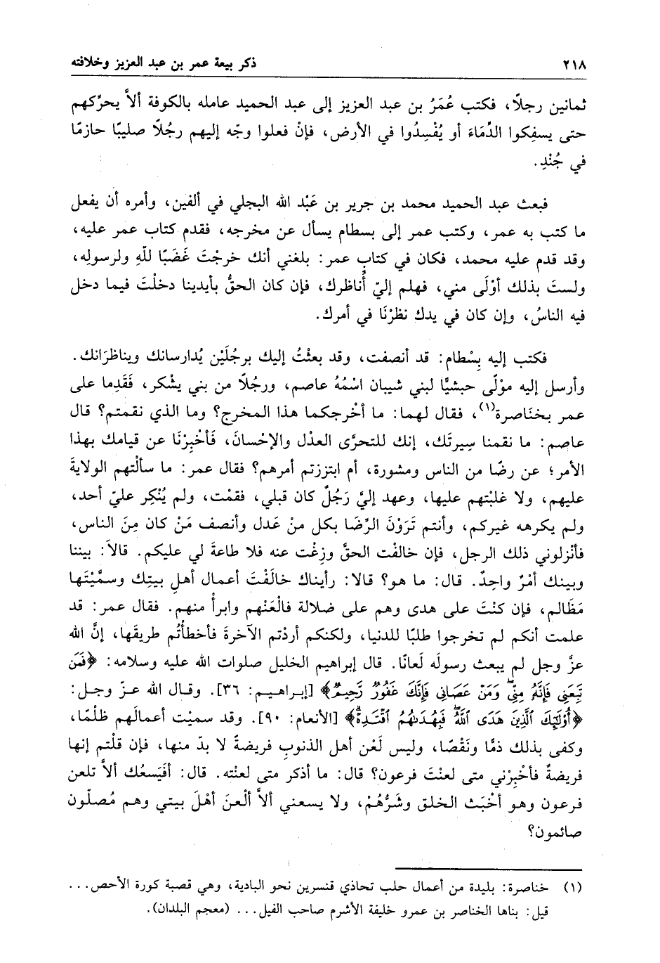 فكتب إليه بسطام : قد أنصفت ، وقد بعثت إليك برجلين يدارسانك ويناظرانك . وأرسل إليه مولى حبشياً لبني شيبان اسمه عاصم ، ورجلاً من بني يشكر ، فقدما على عمر بخناصرة ، فقال لهما : ما أخرجكما هذا المخرج ؟ وما الذي نقمتم ؟ قال عاصم : ما نقمنا سيرتك ، إنك لتتحرى العدل والإحسان ، فأخبرنا عن قيامك بهذا الأمر ؛ عن رضاً من الناس ومشورة ، أم ابتززتم أمرهم ؟ فقال عمر : ما سألتهم الولاية عليهم ، ولا غلبتهم عليها ، وعهد إلي رجلٌ كان قبلي ، فقمت ، ولم ينكر علي أحد ، ولم يكرهه غيركم ، وأنتم ترون الرضا بكل من عدل وأنصف من كان من الناس ، فأنزلوني ذلك الرجل ، فإن خالفت الحق وزغت عنه فلا طاعة لي عليكم . قالا : بيننا وبينك أمرٌ واحدٌ . قال : ما هو ؟ قالا : رأيناك خالفت أعمال أهل بيتك وسميتها مظالم ، فإن كنت على هدى وهم على ضلالة فألعنهم وابرأ منهم . فقال عمر : قد علمت أنكم لم تخرجوا طلباً للدنيا ، ولكنكم أردتم الآخرة فأخطأتم طريقها ، إن الله عز وجل لم يبعث رسوله لعاناً . وقال إبراهيم الخليل صلوات الله عليه وسلامه : فمن تبعني فإنه مني ومن عصاني فإنك غفورٌ رحيم . وقال الله عز وجل : أولئك الذين هدى الله فبهداهم اقتده . وقد سميت أعمالهم ظلماً ، وكفى بذلك ذماً ونقصا ، وليس لعن أهل الذنوب فريضةً لا بد منها ، فإن قلتم إنها فريضةٌ فأخبرني متى لعنت فرعون ؟ قال : ما أذكر متى لعنته . قال : أفيسعك ألا تلعن فرعون وهو أخبث الخلق وشرهم ، ولا يسعني ألا ألعن أهل بيتي وهم مصلون صائمون ؟