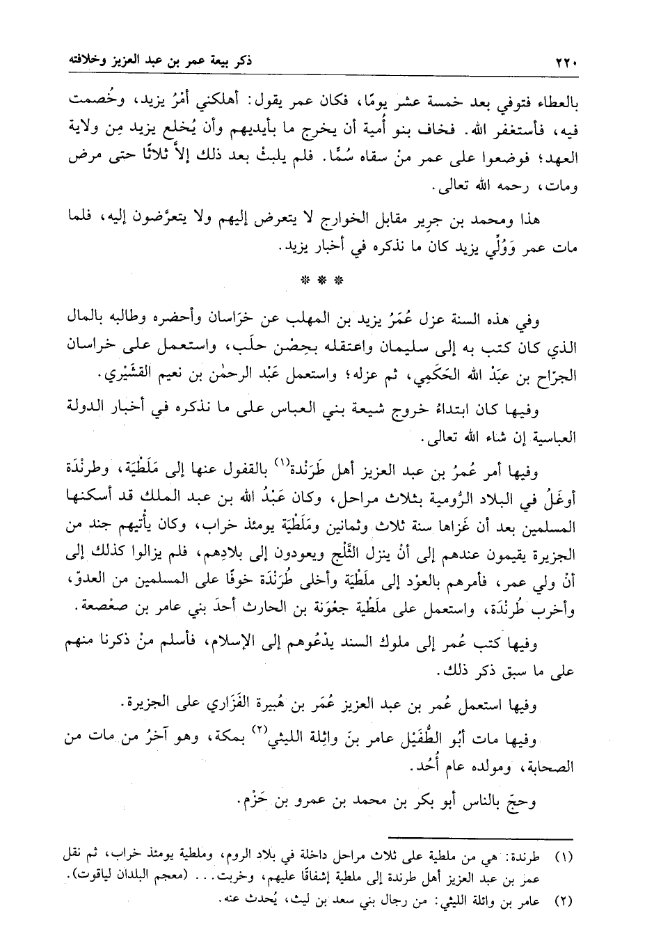 وفيها أمر عمر بن عبد العزيز أهل طرندة بالقفول عنها إلى ملطية ، وطرندة أوغل في البلاد الرومية بثلاث مراحل ، وكان عبد الله بن عبد الملك قد أسكنها المسلمين بعد أن غزاها سنة ثلاث وثمانين وملطية يومئذ خراب ، وكان يأتيهم جند من الجزيرة يقيمون عندهم إلى أن ينزل الثلج ويعودون إلى بلادهم ، فلم يزالوا كذلك إلى أن ولي عمر ، فأمرهم بالعود إلى ملطية وأخلى طرندة خوفاً على المسلمين من العدو ، وأخرب طرندة ، واستعمل على ملطية جعونة بن الحارث أحد بني عامر بن صعصعة .