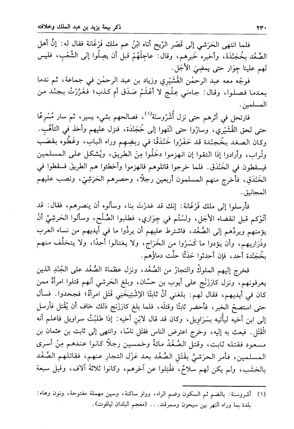 فخرج إليهم الملوك والتجار من الصغد ، ونزل عظماء الصغد على الجند الذين يعرفونهم ، ونزل كارزنج على أيوب بن حسان ، وبلغ الحرشي أنهم قتلوا امرأةً ممن كان في أيديهم ، فقال لهم : بلغني أن ثابتاً الإشتيخني قتل امرأةً ؛ فجحدوا . فسأل حتى استصح الخبر ، فأحضر ثابتاً وقتله ، فلما بلغ كارزنج ذلك خاف أن يقتل فأرسل إلى ابن أخيه ليأتيه بسراويل ، وكان قد قال لابن أخيه : إذا طلبت سراويل فاعلم أنه القتل . فبعث به إليه ، وخرج واعترض الناس فقتل ناساً ، وانتهى إلى ثابت بن عثمان بن مسعود فقتله ثابت ، وقتل الصغد مائةً وخمسين رجلا كانوا عندهم من أسرى المسلمين ، فأمر الحرشي بقتل الصغد بعد عزل التجار عنهم ، فقاتلهم الصغد بالخشب ، ولم يكن لهم سلاحٌ ، فقتلوا عن آخرهم ، وكانوا ثلاثة آلاف ، وقيل سبعة