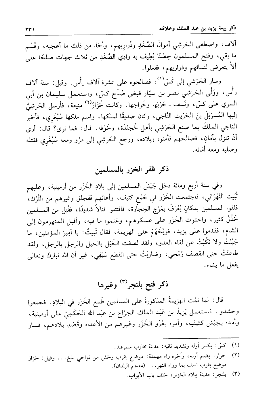 قال : لما تمت الهزيمة المذكورة على المسلمين طمع الخزر في البلاد . فجمعوا وحشدوا ، فاستعمل يزيد بن عبد الملك الجراح بن عبد الله الحكمي على أرمينية ، وأمده بجيش كيفٍ ، وأمره بغزو الخزر وغيرهم من الأعداء وقصد بلادهم ، فسار