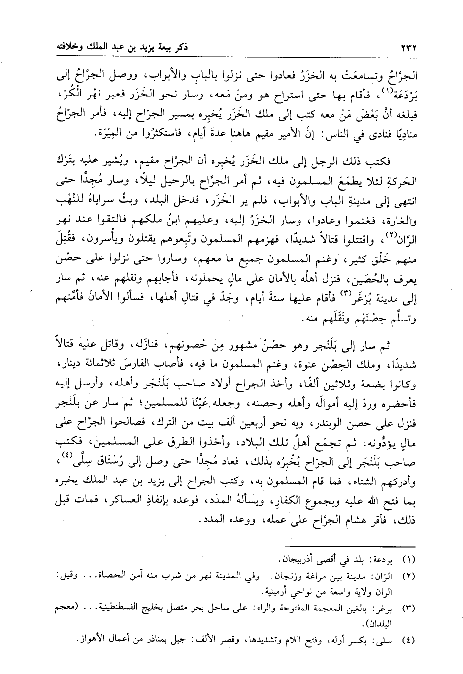 الجراح وتسامعت به الخزر فعادوا حتى نزلوا بالباب والأبواب ، ووصل الجراح إلى بردعة ، فأقام بها حتى استراح هو ومن معه ، وسار نحو الخزر فعبر نهر الكر ، فبلغه أن بعض من معه كتب إلى ملك الخزر يخبره بمسير الجراح إليه ، فأمر الجراح منادياً فنادى في الناس : إن الأمير مقيم ها هنا عدة أيام ، فاستكثروا من الميرة . فكتب ذلك الرجل إلى ملك الخزر يخبره أن الجراح مقيم ، ويشير عليه بترك الحركة لئلا يطمع المسلمون فيه ، ثم أمر الجراح بالرحيل ليلا ، وسار مجداً حتى انتهى إلى مدينة الباب والأبواب ، فلم ير الخزر ، فدخل البلد ، وبث سراياه للنهب والغارة ، فغنموا وعادوا ، وسار الخزر إليه ، وعليهم ابن ملكهم فالتقوا عند نهر الران ، واقتتلوا قتالاً شديداً ، فهزمهم المسلمون وتبعوهم يقتلون ويأسرون ، فقتل منهم خلق كثير ، وغنم المسلمون جميع ما معهم ، وساروا حتى نزلوا على حصن يعرف بالحصين ، فنزل أهله بالأمان على مالٍ يحملونه ، فأجابهم ونقلهم عنه ، ثم سار إلى مدينة برغر فأقام عليها ستة أيام ، وجد في قتال أهلها ، فسألوا الأمان فأمنهم وتسلم حصنهم ونقلهم منه .