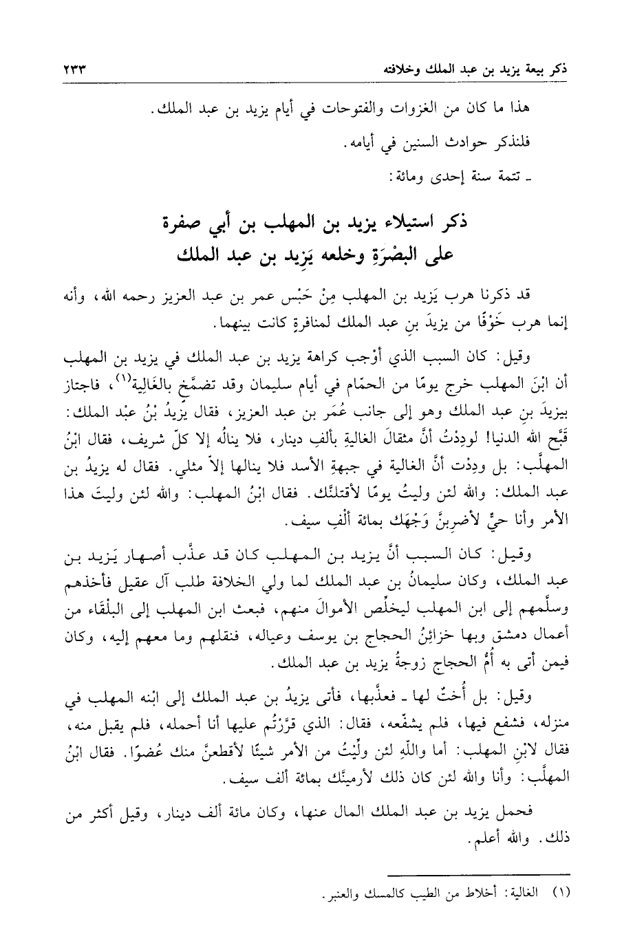 وقيل : كان السبب الذي أوجب كراهة يزيد بن عبد الملك في يزيد بن المهلب أن ابن المهلب خرج يوماً من الحمام في أيام سليمان وقد تضمخ بالغالية ، فاجتاز بيزيد بن عبد الملك وهو إلى جانب عمر ابن عبد العزيز ، فقال يزيد بن عبد الملك : قبح الله الدنيا لوددت أن مثقال الغالية بألف دينار ، فلا يناله إلا كل شريف ، فقال ابن المهلب : بل وددت أن الغالية في جبهة الأسد فلا ينالها إلا علي . فقال له يزيد بن عبد الملك : والله لئن وليت يوماً لأقتلنك . فقال ابن المهلب : والله لئن وليت هذا الأمر وأنا حي لاضربن وجهك بمائة ألف سيف .