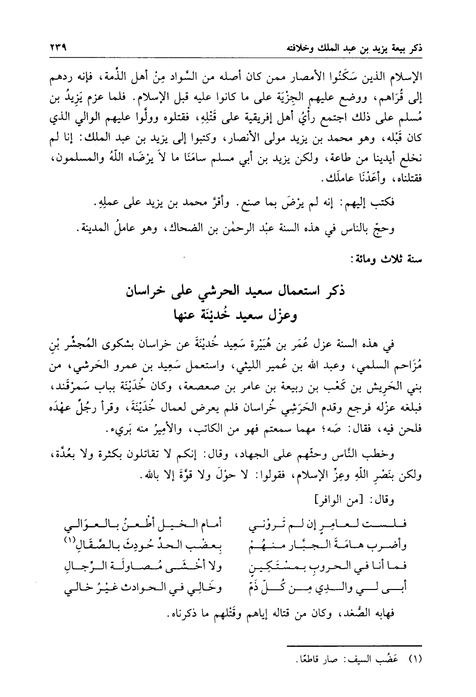 الإسلام الذين سكنوا الأمصار ممن كان أصله من السواد من أهل الذمة ، فإنه ردهم إلى قراهم ، ووضع عليهم الجزية على ما كانوا عليه قبل الإسلام . فلما عزم يزيد بن مسلم على ذلك اجتمع رأي أهل إفريقية على قتله ، فقتلوه وولوا عليهم الوالي الذي كان قبله ، وهو محمد بن يزيد مولى الأنصار ، وكتبوا إلى يزيد ابن عبد الملك : إنا لم نخلع أيدينا من طاعة ، ولكن يزيد بن أبي مسلم سامنا ما لا يرضاه الله والمسلمون ، فقتلناه ، وأعدنا عاملك .