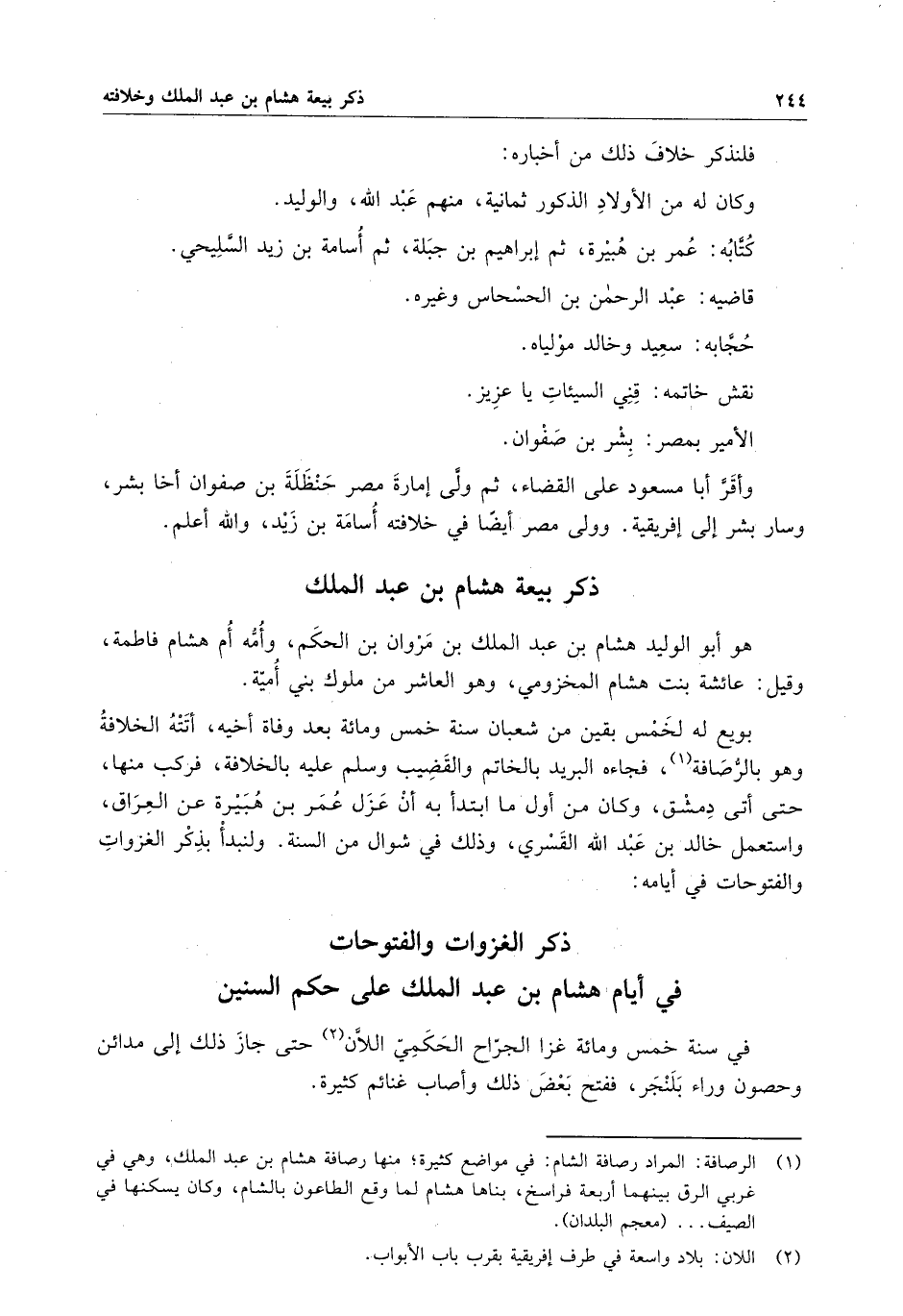 وأقر أبا مسعود على القضاء ، ثم ولي إمارة مصر حنظلة بن صفوان أخا بشر ، وسار بشر إلى إفريقية . وولي مصر أيضاً في خلافته أسامة ابن زيد ، والله أعلم .